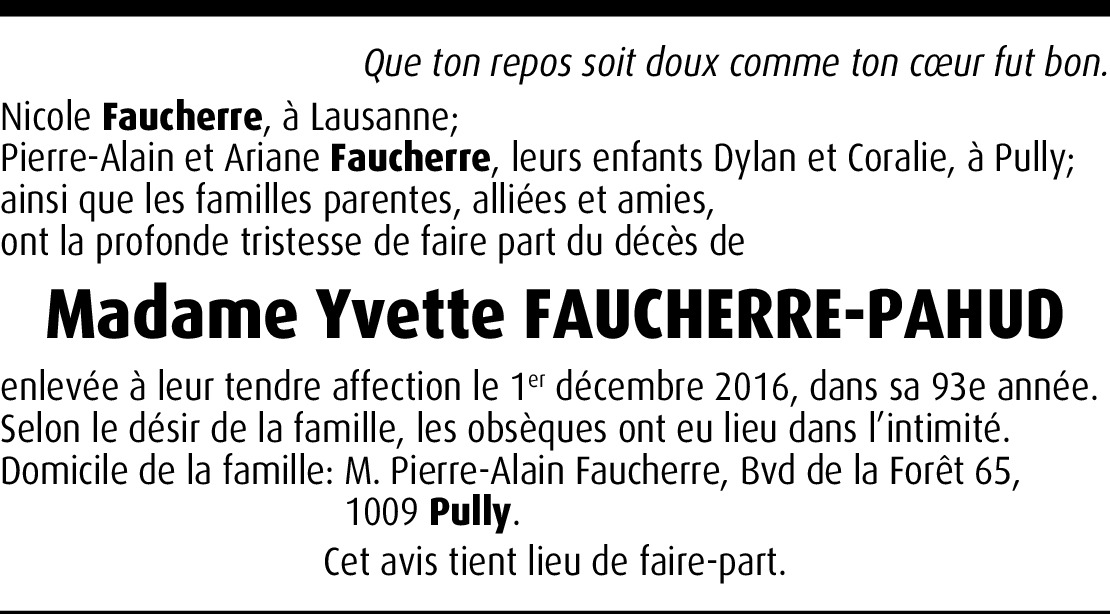 Vor mehr als 4 Jahren Melden Chère Famille, c'est avec tristesse que j'ai appris la nouvelle. Je suis en pensées avec vous en ces moments pénibles et vous présente mes sincères condoléances. Von Jean-François Chappuis