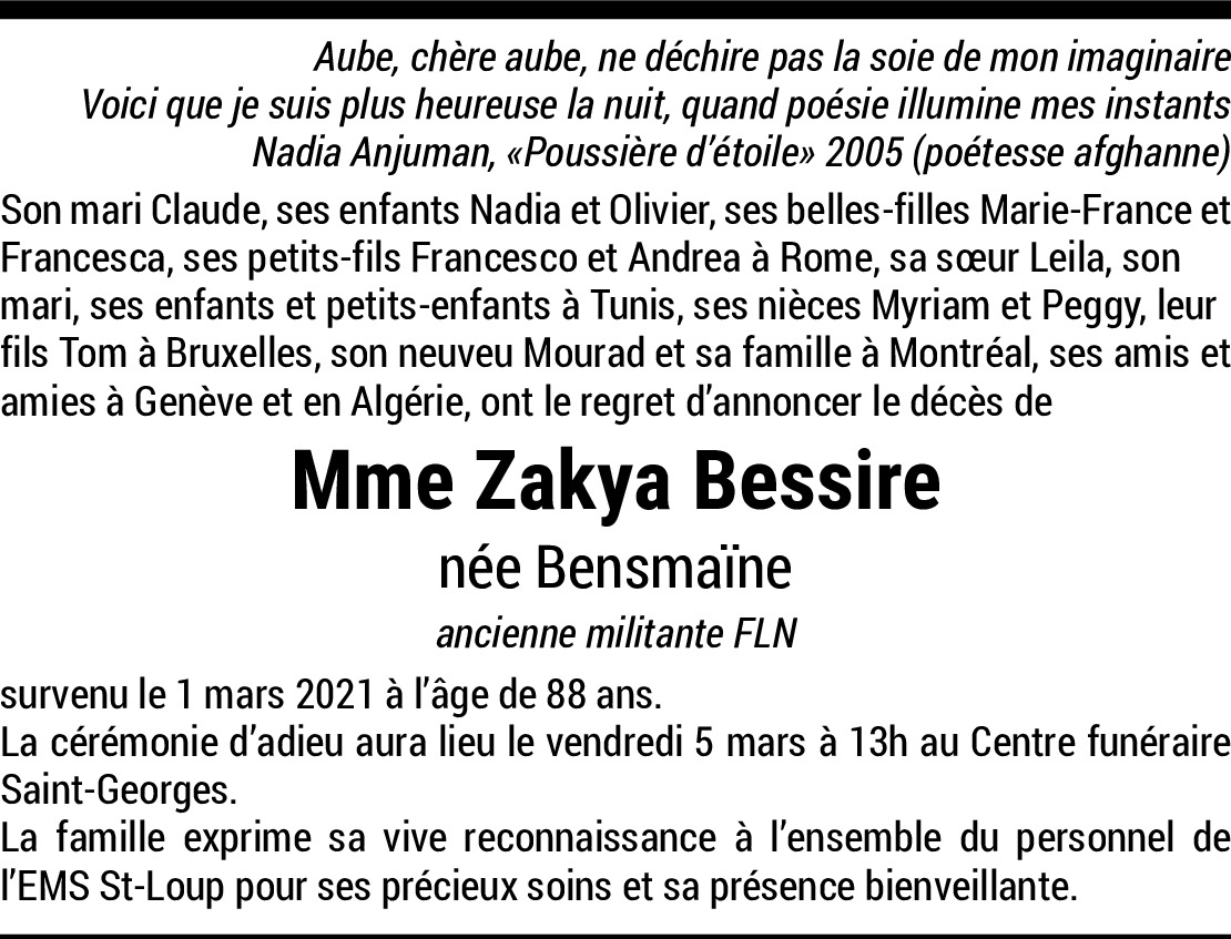 Chers Claude, Nadia et Olivier, c'est avec beaucoup de tristesse que nous avons appris la disparition de Zakya. Nous sommes de tout cœur avec vous. Nos plus sincères condoléances. Anissa Redjimi Ibnou-Zekri et ses enfants:Leila, Chaquib et Nabila