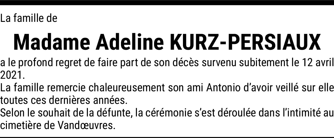 Il y a plus de 4 ans Report C'est avec une grande tristesse, que j'apprends le décès de ma cousine Adeline Kurz. Toutes mes sincères condoléances à sa famille et à ses proches Noutch Amneris Ibanez 9 chemin des Cyprès 13 600 Ceyreste France De la part de Amneris Ibanes