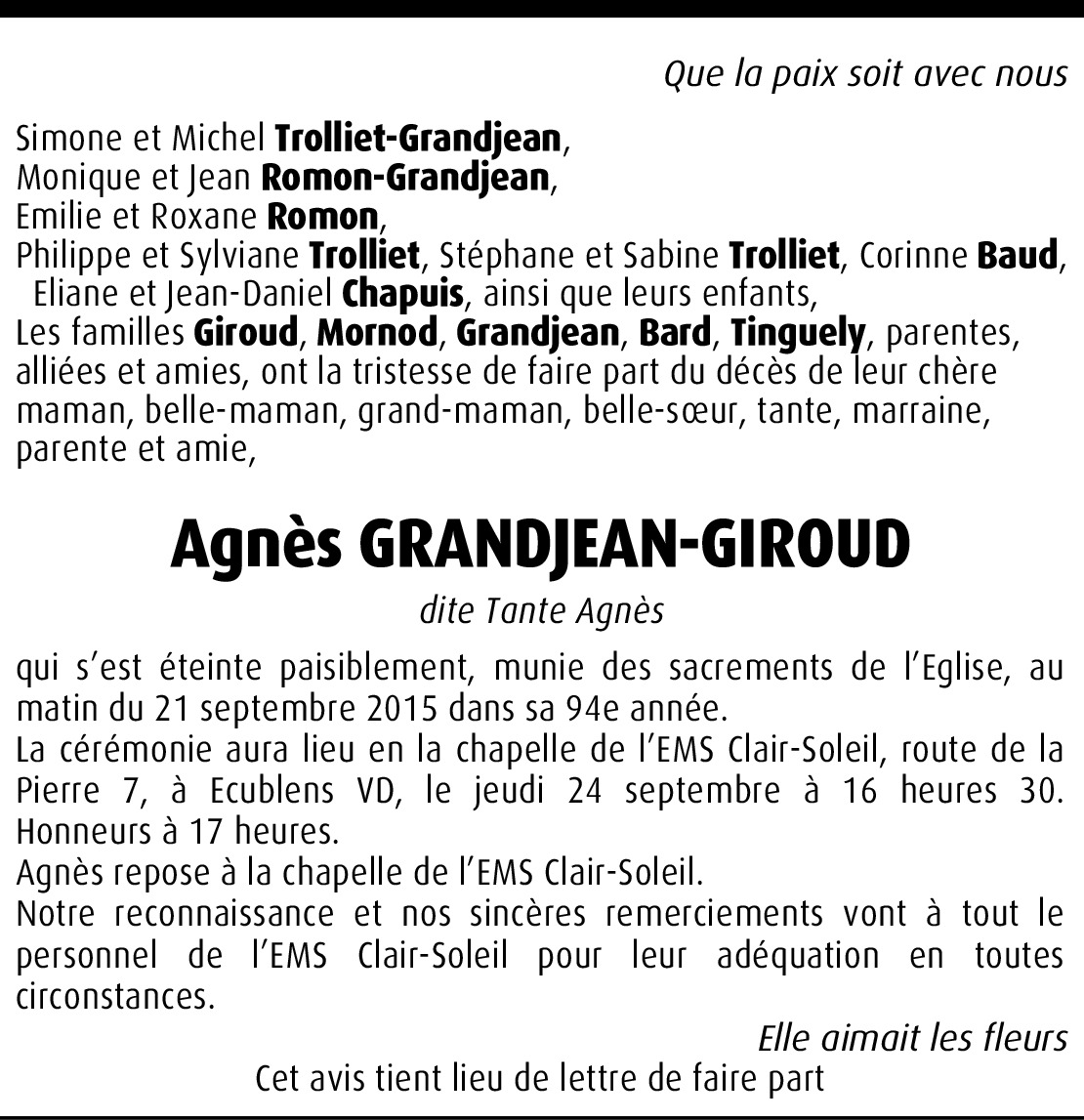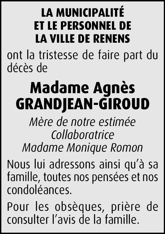Chère famille, c'est avec beaucoup de tristesse que nous apprenons la nouvelle du décès de Madame Agnès Grandjean, membre de notre association. Par la présente, nous voudrions vous adresser tous nos messages de condoléances et vous prions d'agréer, chère famille, nos meilleures pensées et nos salutations distinguées. DEREKO Le secrétaire Claude Delacrétaz