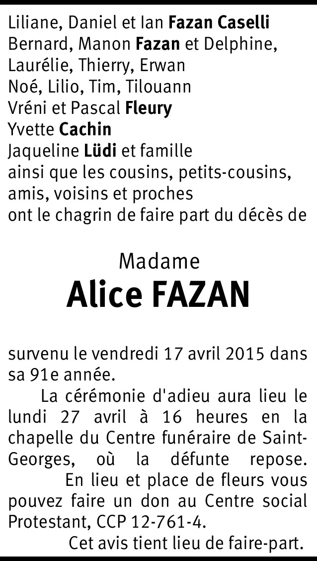 Ayant appris la disparition de votre Chère Maman trop tard pour pouvoir lui dire adieu pour la dernière fois, j'aimerais exprimer mes condoléances sincères à toi, Liliane, et à toi, Bernard. Alice et moi, nous avons partagé bien des choses pendant pas mal d'années. C'était une femme ouverte d'esprit et généreuse, quelqu'un d'authentique qui savait écouter, comprendre et consoler, une femme qui avait du courage et ne se laissait jamais abattre. Même si on s'est perdu de vue ces dernières années, je garde le souvenir d'une vraie amie sur laquelle on pouvait compter en toute circonstance. Mes pensées sont avec vous et vos enfants en ce temps difficile. Elfriede (Elfie) Riegler