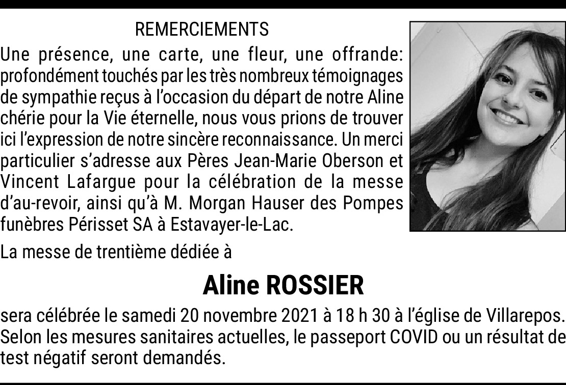 Chère Aline Rossier ❤️ Je voulais écrire ces quelques mots pour te remercier d’être passé dans ma vie au moment où j’en avais besoin tu m’as beaucoup apporté tu a toujours été un exemple pour moi on s’est rencontré via mon activité en ligne et je suis heureux d’avoir pu te rencontrer j’aurais tellement aimé te rencontrer en vrai tu es une personne qui compte énormément pour moi et tu vas terriblement me manquer sache que le monde a perdu une personne magnifique Je t’aime énormément et tu vas terriblement me manquer repose en paix bisous Aline J’espère que tu vas trouver la paix où tu es je t’aime ❤️
