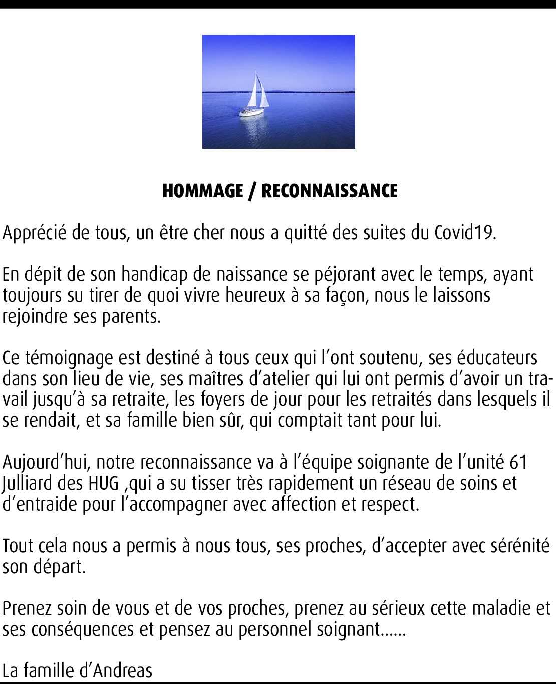 S'agit-il d'Andréas que j'ai connu il y a très longtemps à la SGIPA ? Avec son regard à vous faire fondre ? Et sa soeur qui était dans une classe de Michel Laufer à la Gradelle ? Vrai ou faux, je vous adresse toute mon amitié et mes voeux de courage.