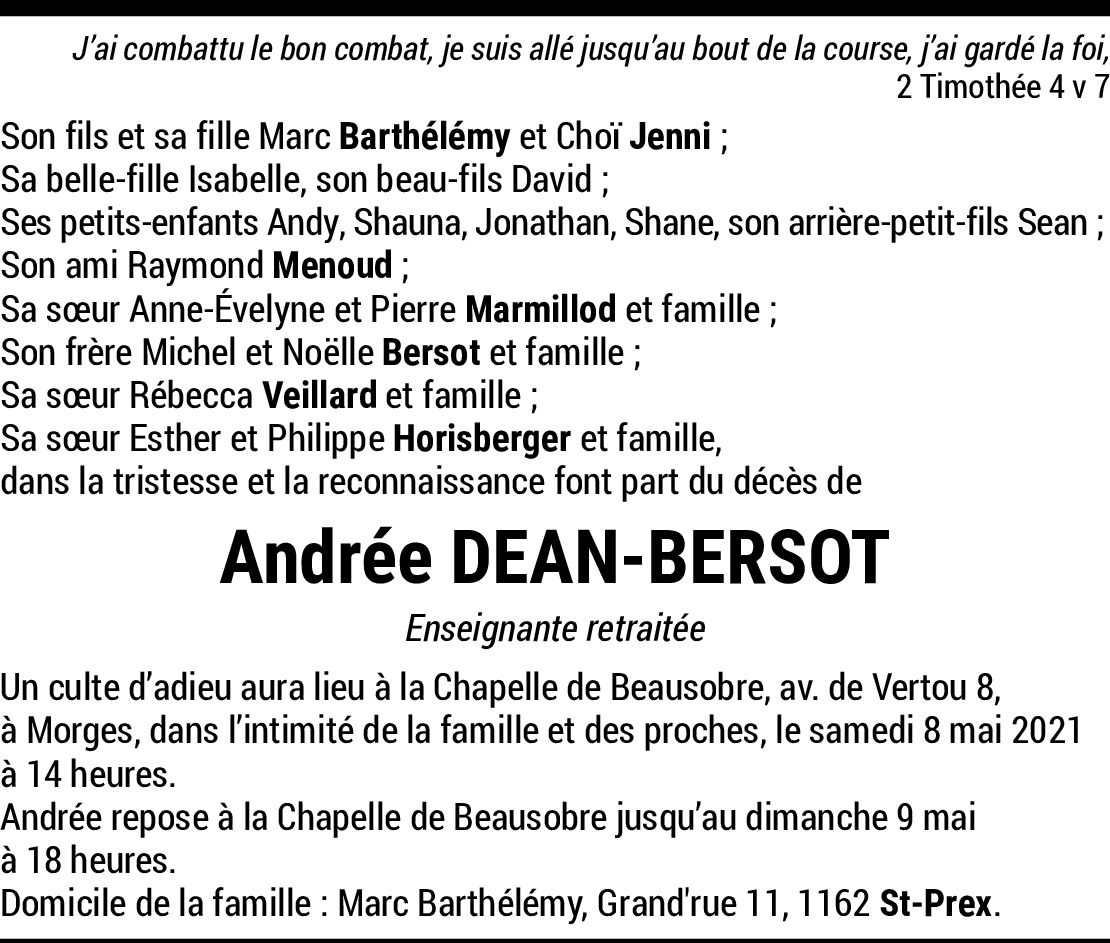 Toutes mes condoléances à la famille d’Andrée, mon estimée ancienne collègue à l’école de Balexert à Genève.