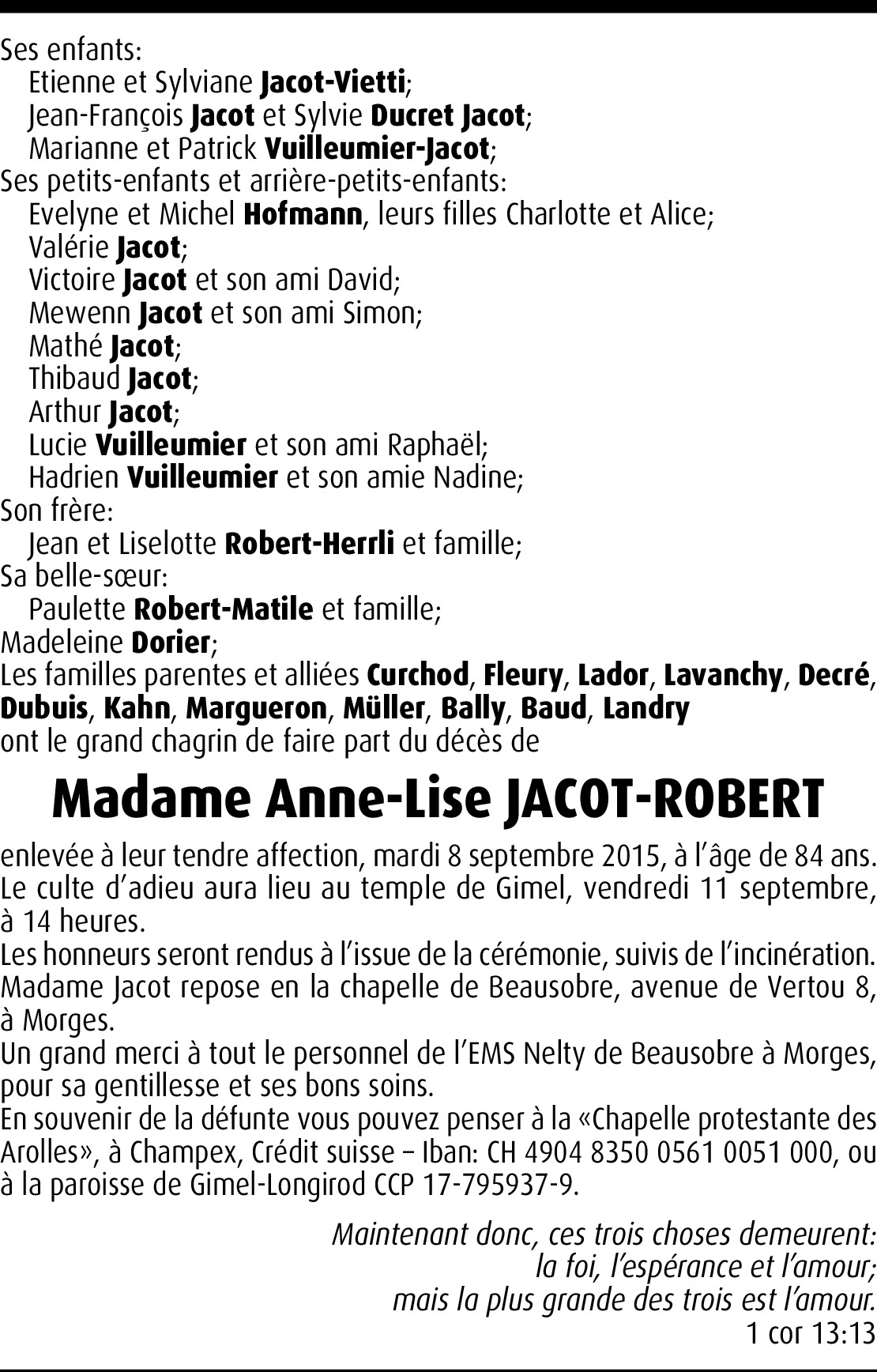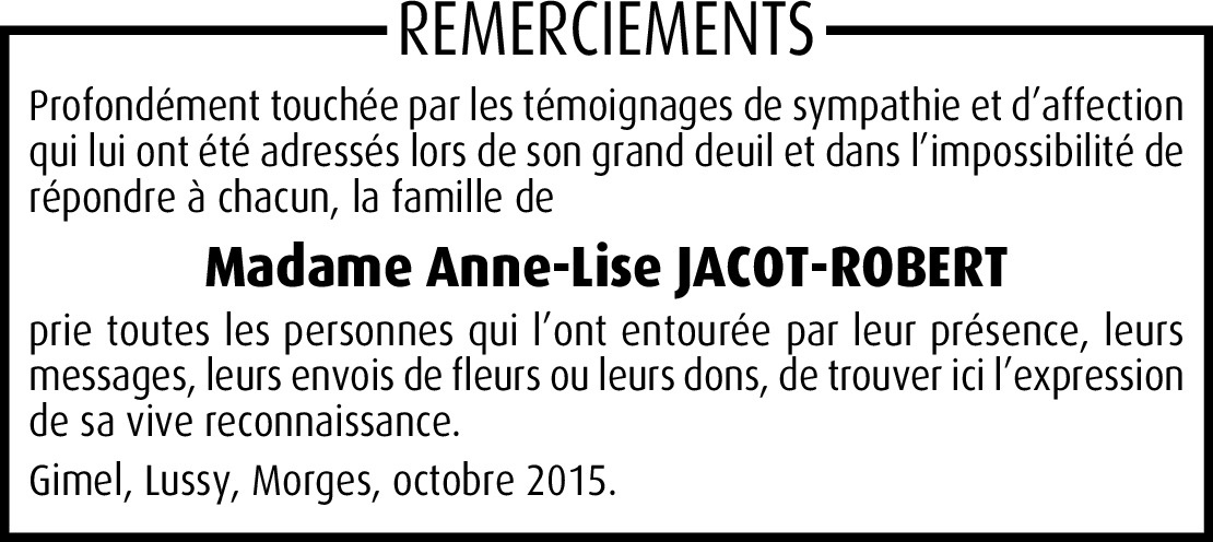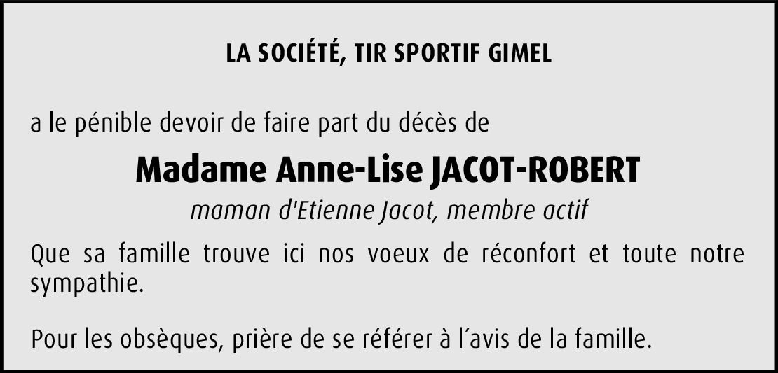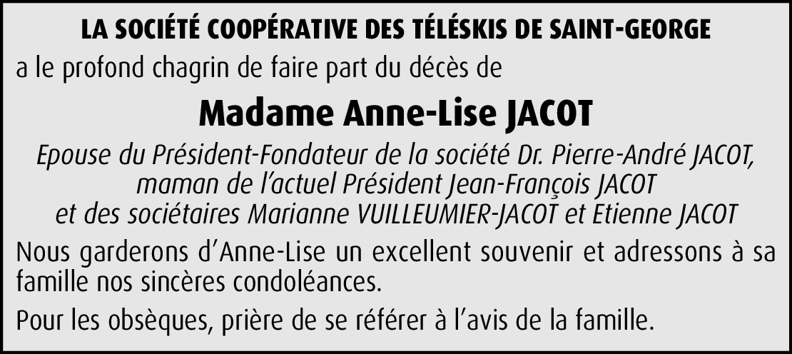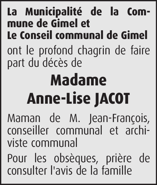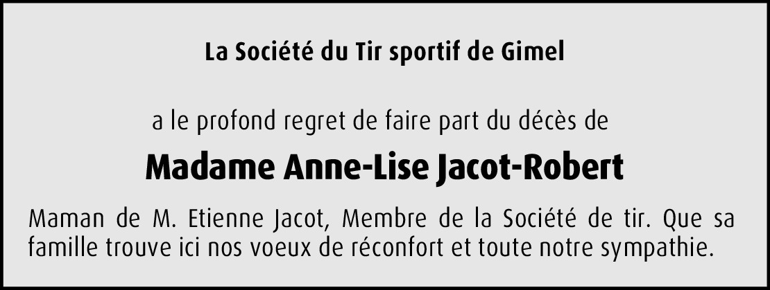 Bien chères familles, c'est avec beaucoup de peine que je prends connaissance de la triste nouvelle du décès d'Anne-Lise. J'en garderai un souvenir ému et reconnaissant, car l'ayant côtoyée de très nombreuses fois que cela soit à l'Espérance, à l'Eglise, à Saint-Georges, etc., j'ai pu apprécier son dévouement, ses innombrables qualités, sa gentillesse aussi. De tout cœur avec vous durant cette douloureuse épreue, je vous adresse, ainsi que mon épouse, nos plus sincères condoléances et nos cordiaux messages.
