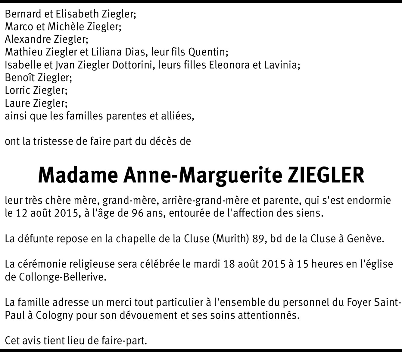 Nous avons encore pu la croiser en forme au Foyer Saint Paul voilà une année et garderons le souvenir d'une maman dévouée à sa famille.