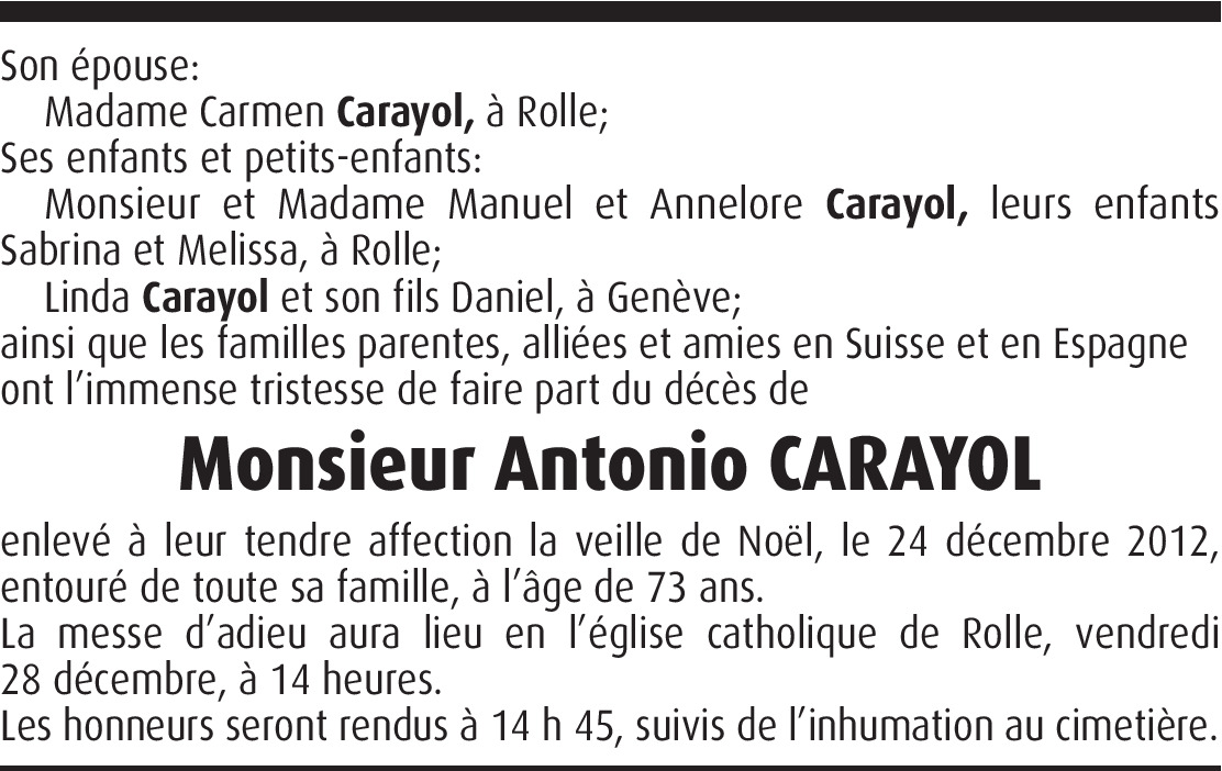 A mon très cher Yayo. Nous nous sommes connus il y a 24 ans. Nous avons eu pas mal de discussion agitée avant de nous connaître vraiment. Mais au final ça valait le coup, on a fait plein de choses ensemble. Un de mes meilleurs souvenirs c'est quand tu as joué le capitaine des caraïbes à Disneyland. Lorsque nos filles sont arrivées, j'ai commencé à t'appeler pépé. Au début, tu détestais ça, mais avec le temps c'est devenu un surnom affectueux. Même que quand je ne t'appelais pas comme ça, tu me demandais si j'étais fâchée. Le 24 au matin tu m'as préparé une tartine, tu étais en pleine forme, on preparait une belle fête de Noël. Je t'en veux de nous avoir laissé aussi subitement. Tu m'as offert le plus beau des cadeaux. Ton fils. Pour toutes ces années de bonheur partagée ensemble, je veux te dire un grand merci. Tu resteras à jamais dans nos cœurs. J'ai beaucoup de peine. À mon pépé adoré. Repose en paix. Pour toujours dans nos cœurs. Annelore.