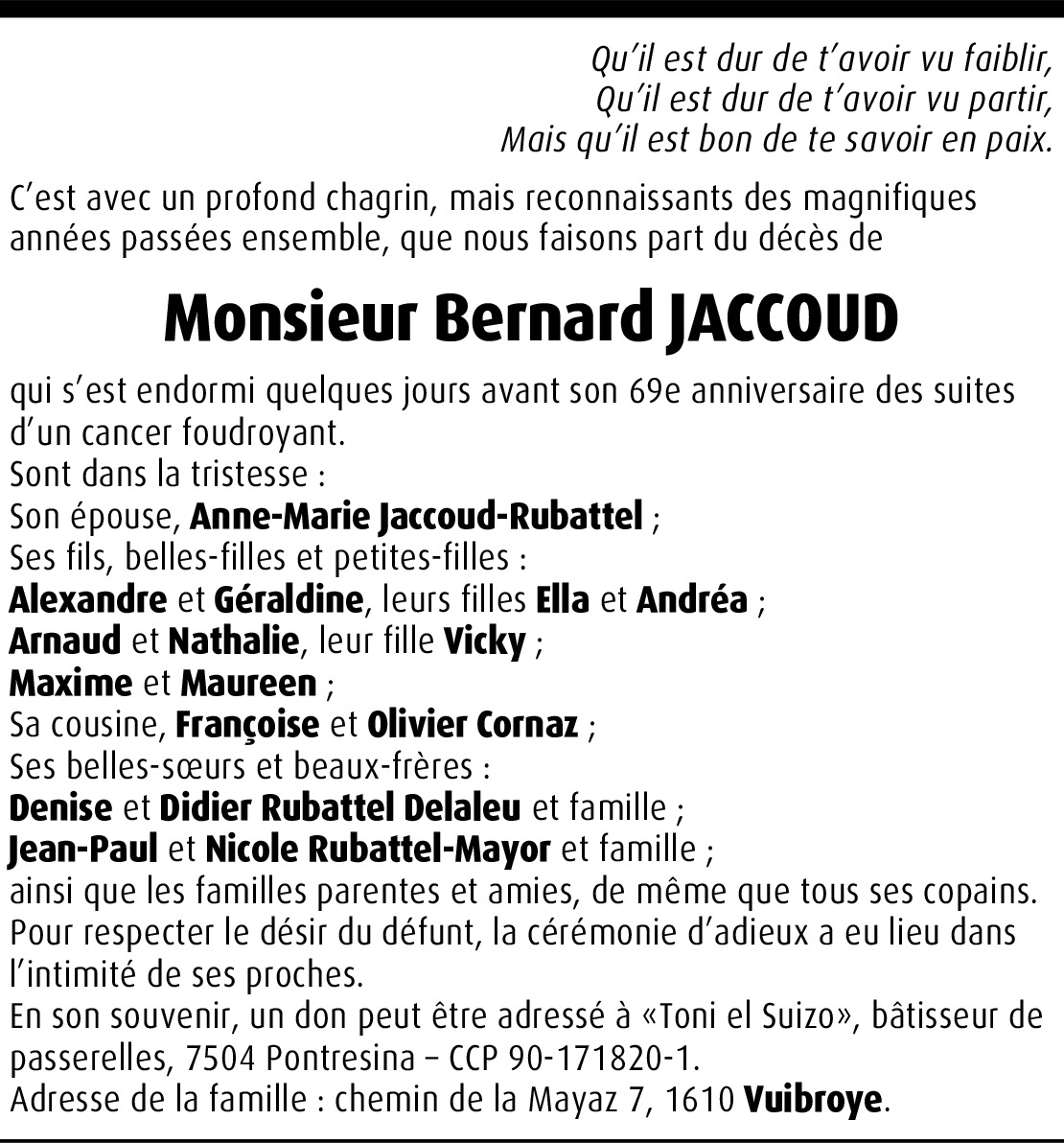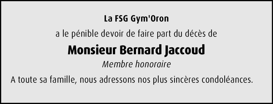 Chère famille, c'est avec tristesse que nous avons appris la nouvelle. L'ayant bien connu pour avoir eu l'occasion de le côtoyer et de travailler avec lui lorsque j'étais Président de la société de gym des Jeunes Patriotes d'Oron! Bernard était un gars super sympa, toujours prêt à rendre service et plein d'humour. Il a assumé avec compétence le secrétariat de la société et il était un gymnaste assidu. Nous sommes en pensées avec vous et nous vous présentons nos sincères condoléances.