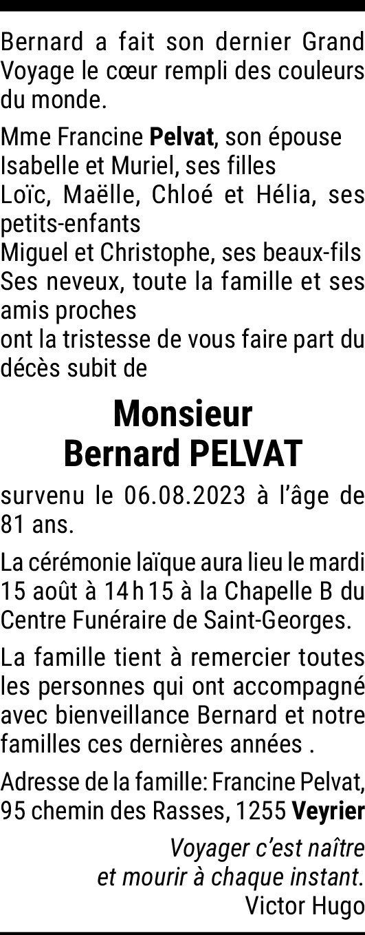 11.08.2023 Signaler Repose en paix mon parrain oncle, tu as rejoint mon père aussi parti en août. Courage à Francine ma marraine et tante. Les deux cousines aussi. Ton neveux Fred, mon fils Swan ma compagne Sandra. De la part de Vuichard