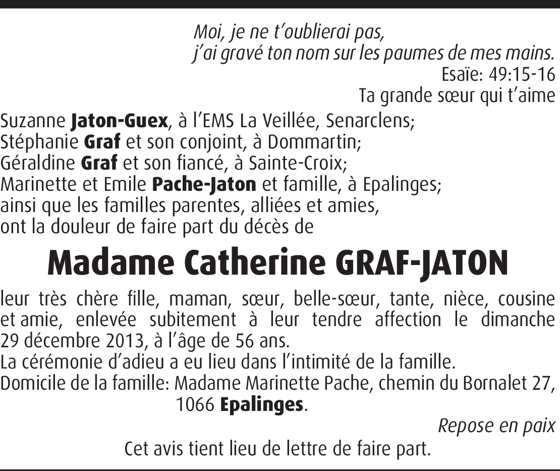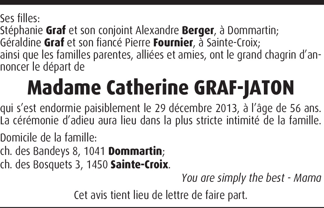 Il y a plus de 4 ans Signaler Toutes nos condoléances à la famille. Nous sommes toujours sous le choc de la disparition de Catherine qui était notre voisine. De la part de Nicole Mattenberger