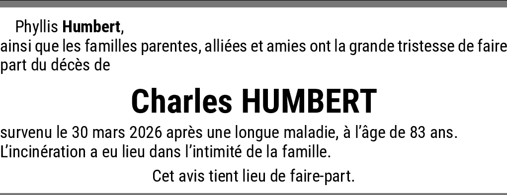 Avis de décès 07.04.2026 Signaler Chère Anne, Reçoit toutes ma sympathie à l'occasion de la disparition de Charles. Avec mes salutations amicales. Birgitta De la part de Birgitta Fumasoli