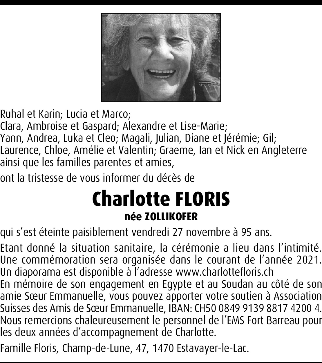 Une grande amie qui s'en va. Une lumière qui s'éteint. Toute sa vie elle a fait le bien, débordant de projets, malgré l'âge. Elle était restée très attachée à l'Egypte où elle a longtemps vécu et où elle venait me voir, quelquefois avec Evellyn, récemment et trop tôt disparue. Elles nous manqueront toutes deux mais resteront dans notre souvenir, faisant partie de ces personnes qui ne partent jamais vraiment.