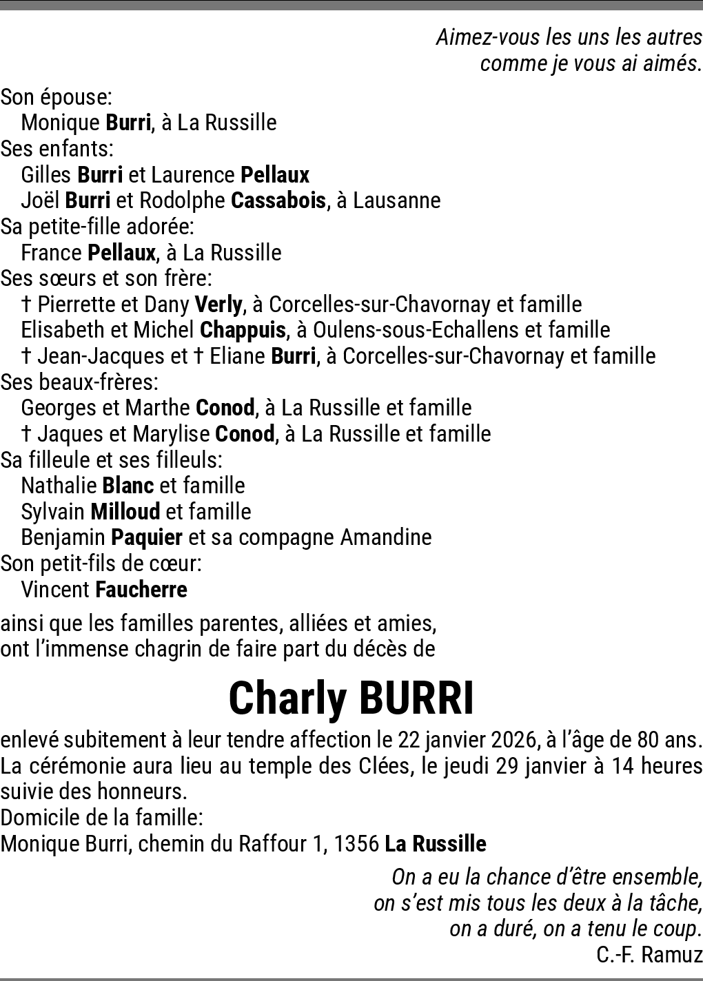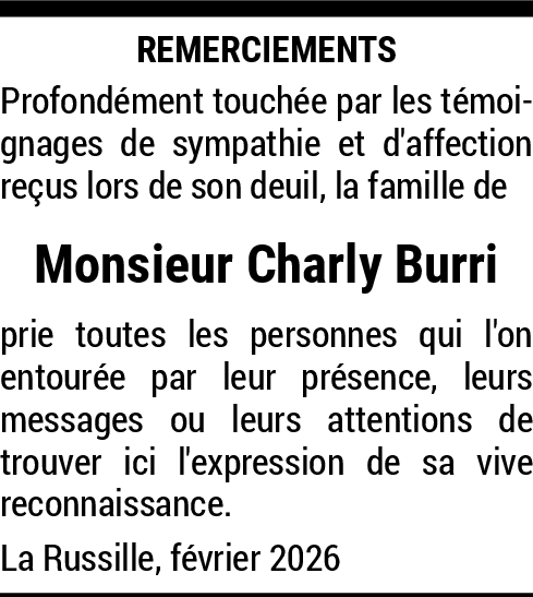 Sympathies 27.01.2026 Signaler Recevez, en famille, ma profonde sympathie en ce moment douloureux de la séparation. De la part de Ermini-Desponds. Marlyse