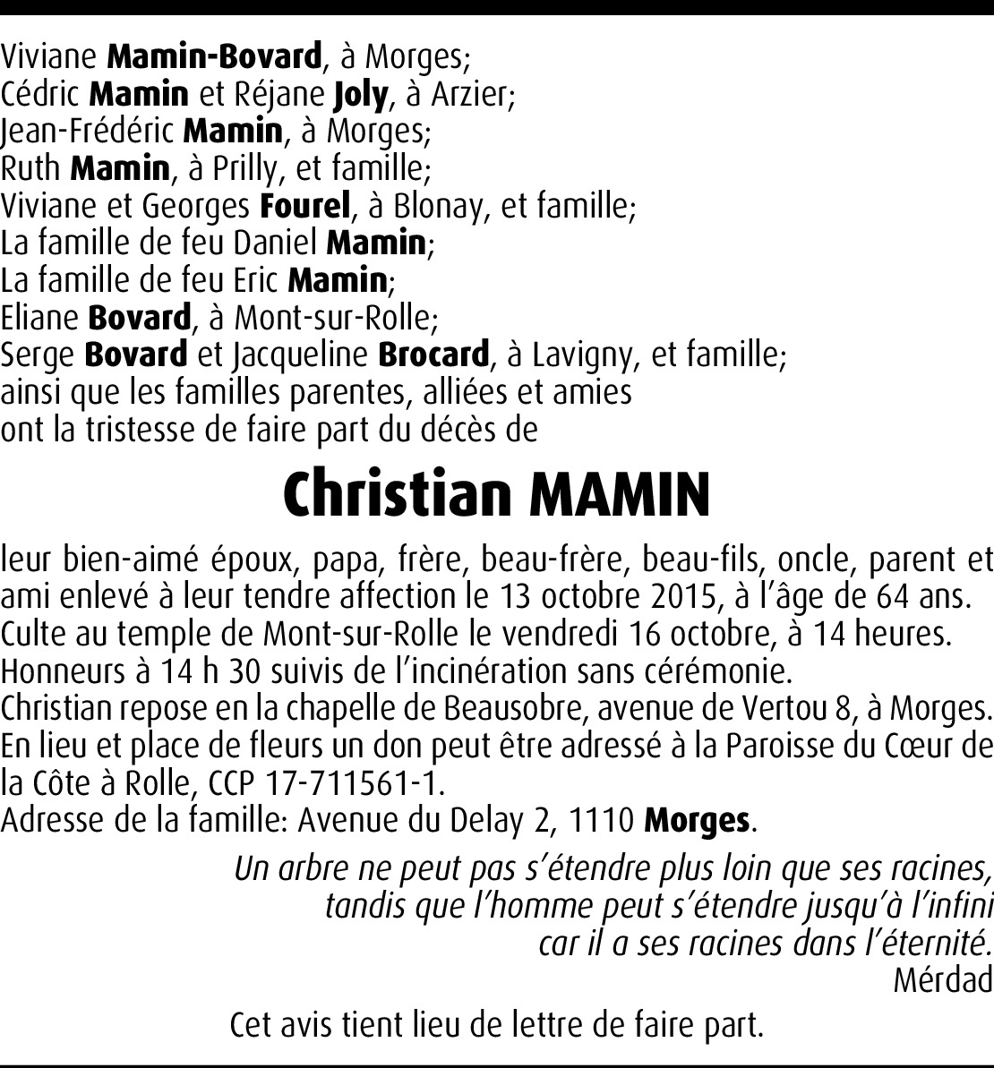 Chère Famille, les mots sont bien pauvres en de telles circonstances. Toutefois je me fais le messager de la classe d’apprentissage CFF 67/68 pour vous dire toute notre émotion à l’annonce du départ de Cri-Cri, notre pote de classe. Plusieurs d’entre nous ne pourrons être présents aux obsèques pour différents motifs valables, mais sachez que nous sommes tous en pensées en ces moments difficiles. Nous garderons un souvenir lumineux d’un camarade jovial, sympathique et ouvert, et plus particulièrement de la rencontre qu’il a organisée en 2011 à Morges-la-Coquette. Adieu l’Ami!