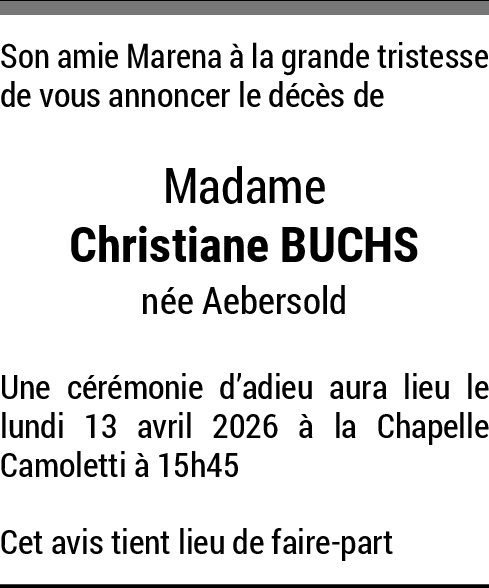 Adieu 07.04.2026 Signaler Adieu, Cristiane. Repose en paix. Courage, Marèna. Je suis en pensées avec toi. De la part de Daniel Wagner