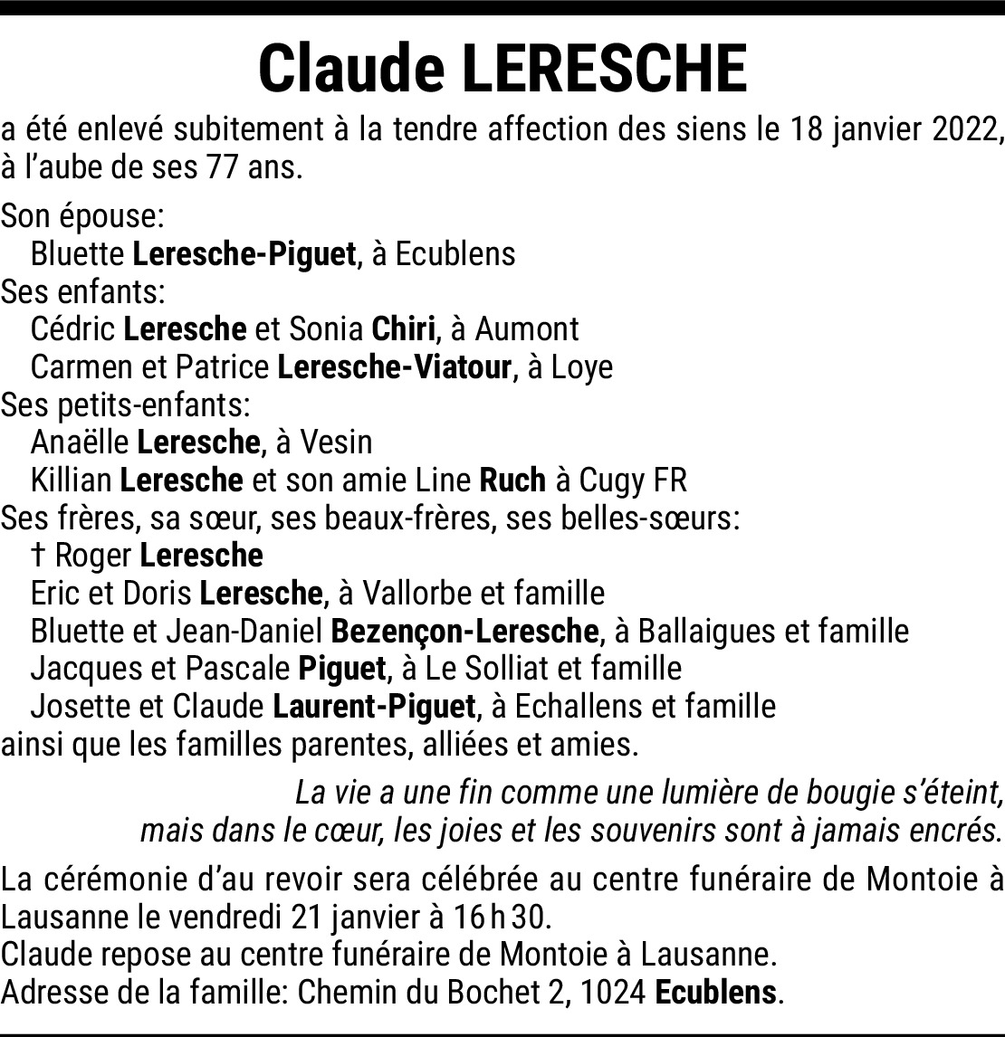 Chère famille, c'est avec beaucoup de tristesse que j'apprends le décès de votre cher époux, papa, frère et parent. Je tiens à vous dire ma vive sympathie ainsi que mes sincères condoléances. Je garderai de Claude le meilleur souvenir. J. Chapuis, Vallorbe.