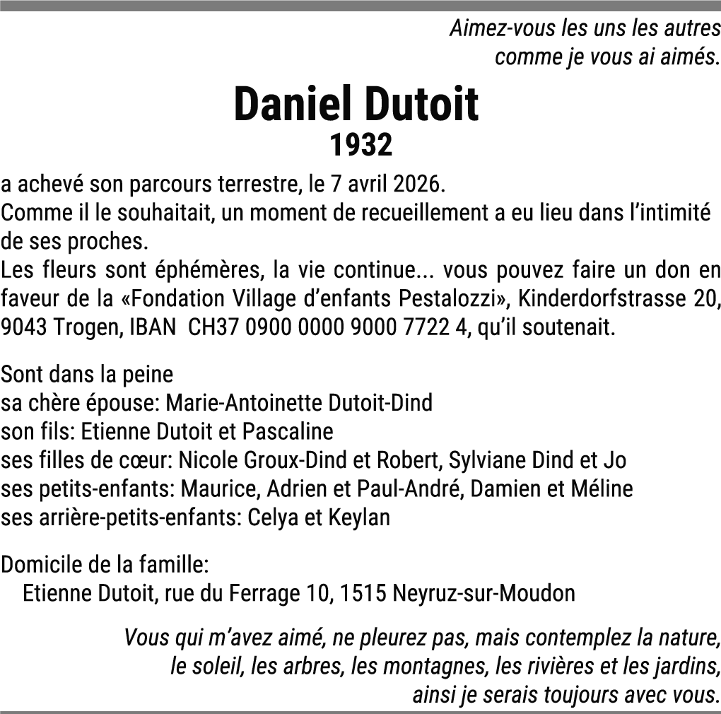 Deuil Daniel Dutoit 18.04.2026 Signaler Chère famille, En pensées avec vous en ces moments pénibles et sincères condoléances. De la part de Chappuis Jean-François