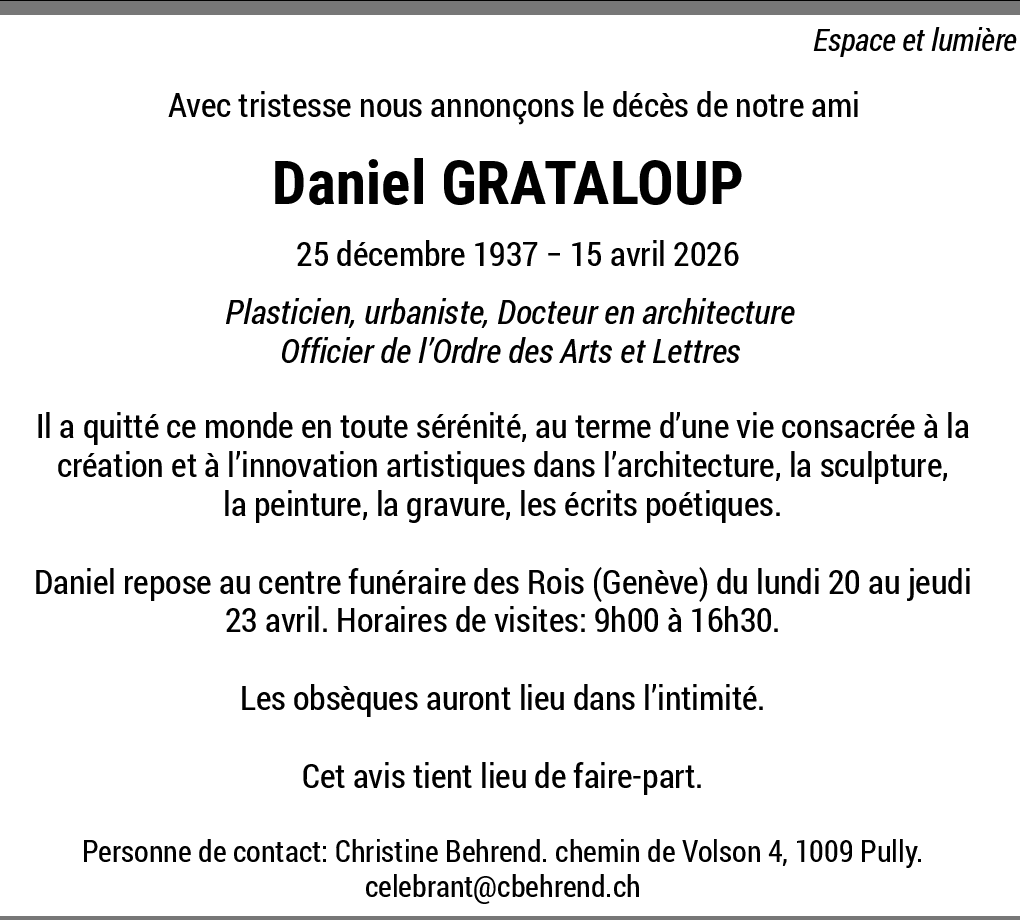 Tristesse et gratitude 20.04.2026 Signaler Cher Daniel, Le monde est plus pauvre sans vous, mais infiniment plus riche de tout ce que vous avez offert à l’humanité — un héritage pour l’éternité. Avec une profonde tristesse et une immense gratitude, Daniela De la part de DANIELA CHRZANOVSKI