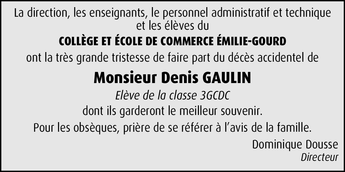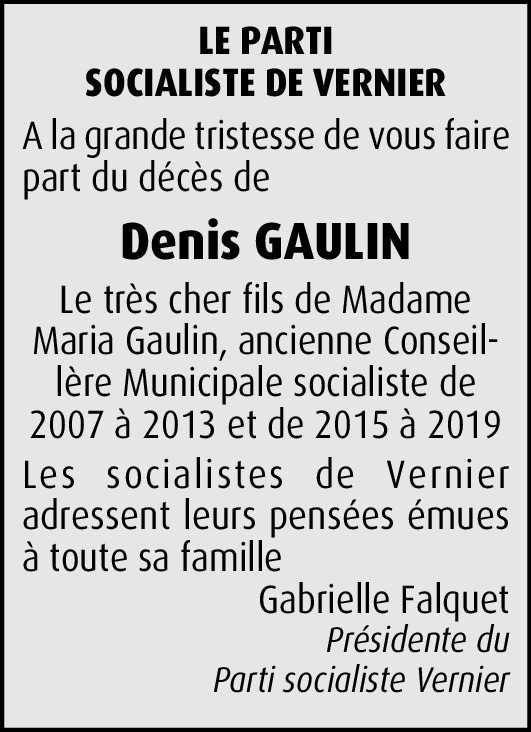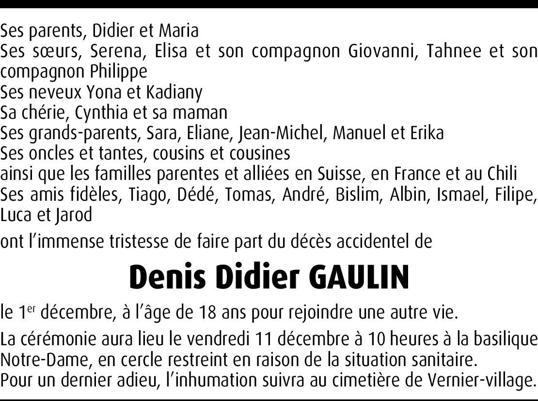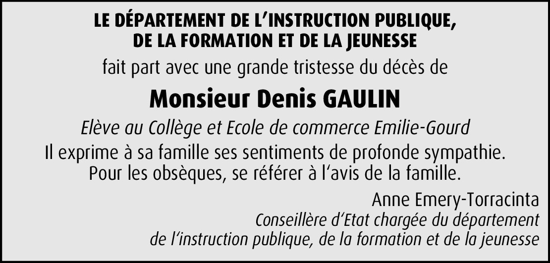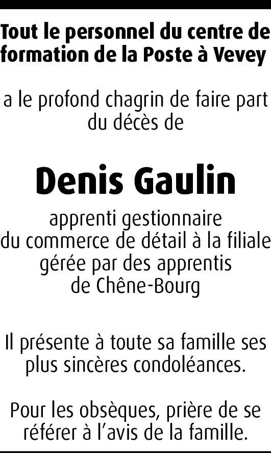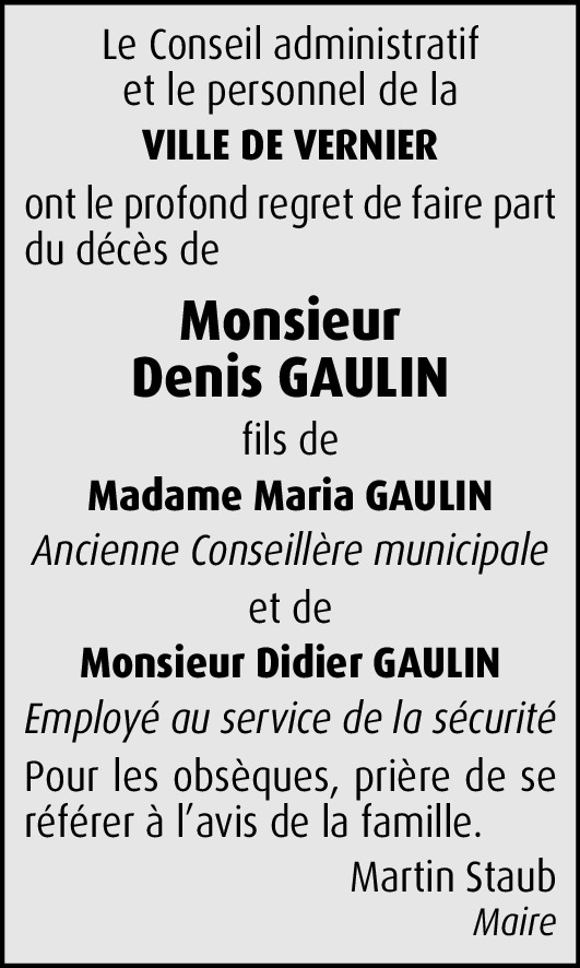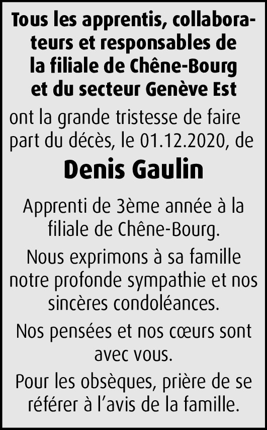 J'habite Vernier-Village depuis 13 ans, je suis la maman de 3 garçons de 15, 17 et 19 ans. Je connais de vue votre belle famille et j'ai toujours eu beaucoup d'admiration pour vous, car si j'ai eu 3 enfants mais un à la fois, en avoir 3 d'un coup, cela a dû être difficile au début, mais 3 beaux enfants ont grandi et je les voyais souvent dans le quartier ou au promotion. Ce que vous vivez aujourd'hui est injuste et c'est une épreuve qui n'est pas dans l'ordre des choses, nous parents, on devraient partir avant nos enfants. Mais le destin de Denis était tout autre. Aujourd'hui il y a ses funérailles, et je viendrai dire au revoir à votre fils, oui au revoir et non adieu, car je crois fermement qu'un jour on sera tous réunis. Aujourd'hui tous les parents de Vernier-village ont perdu un fils et souffrent avec vous. Nous sommes tous choqués et pensons fort à vous. Toutes mes pensées et je vous souhaite beaucoup de courage, car il vous en faudra, mais lui il sera toujours là, à côté de vous. Géraldine