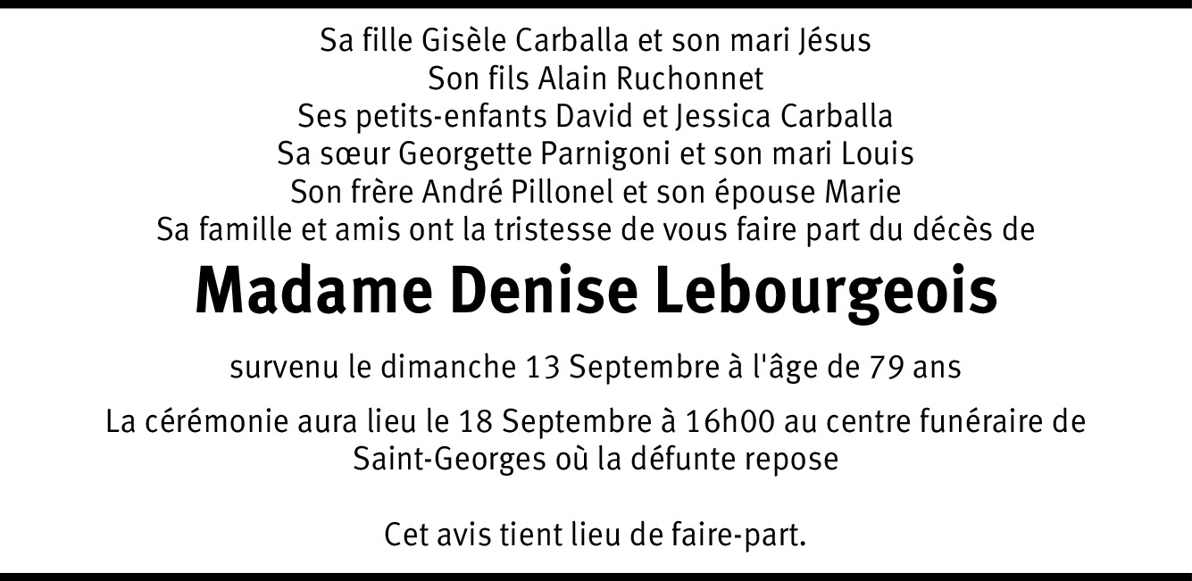 C'est avec une grande tristesse que j'apprends le décès de ma tante par alliance Denise, je garde le souvenir d'une femme chaleureuse et généreuse, elle rejoint mon oncle Henri décédé récemment. Je présente mes plus sincères condoléances à sa famille que j'embrasse bien fort.