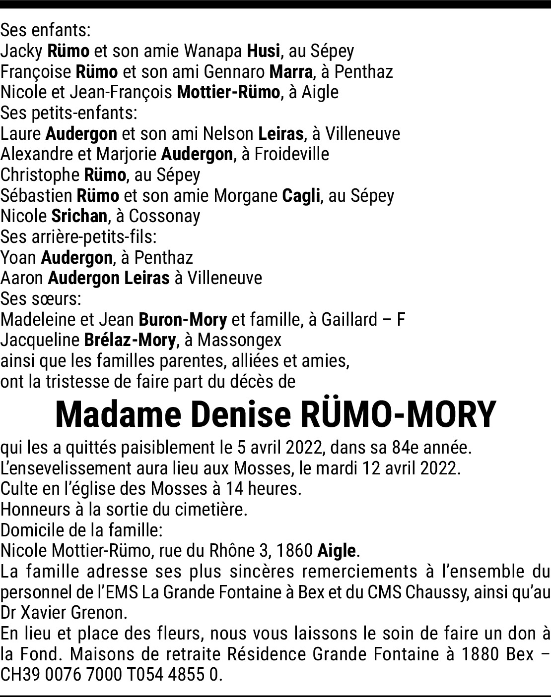 Chères Nicole, Françoise, Cher Jacky et familles, Denise vous quitte, Denise nous quitte. C'est la dernière page d'un grand livre qui se tourne. Un livre de tellement bons moments partagés où Denise nous accompagnait avec son accordéon et sa bonne humeur qu'elle savait propager autour d'elle. Je suis ému et je pense fort à vous mais il m'est impossible de venir rendre hommage à notre Denise mardi. Je vais aller allumer une bougie demain en pensant fort à vous et aux bons moments partagés avec votre maman. Je vous embrasse fort car je sais la douleur qu'est la perte d'une maman. Que Dieu vous accompagne et prenne soins de Denise dans son paradis où elle aura à ne pas douter sa place. Avec émotions. Daniel et Véronique Jung/Mayoraz