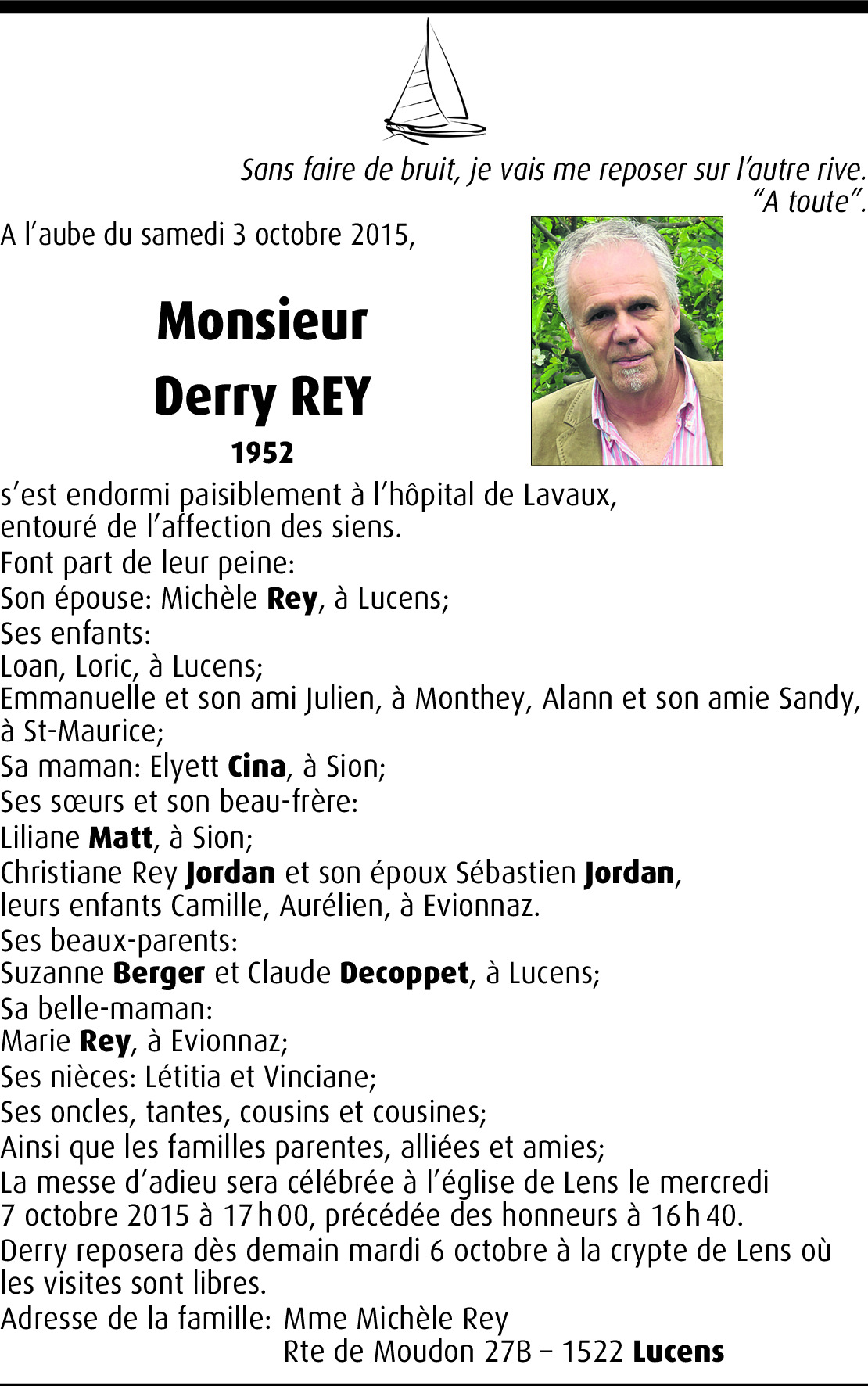 Chère famille, j ai appris la triste nouvelle et je vous adresse mes sincères condoléances. Derry était un ami cher, toujours prêt à me venir en aide, si nécessaire, toujours prêt à refaire le monde, toujours si attentif - aujourd'hui mes pensées l'accompagnent là où il va. Salomé Ramelet