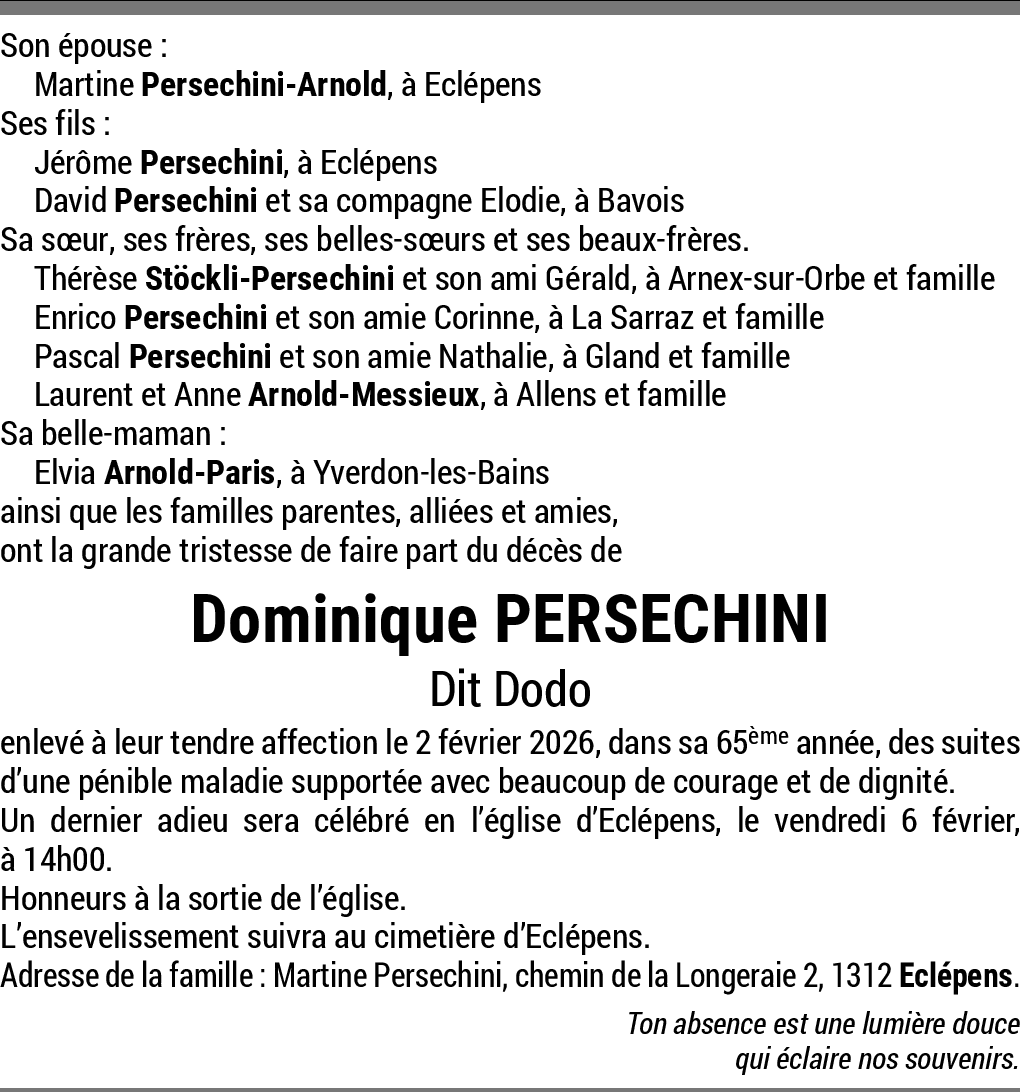 Chère Famille, 05.02.2026 Signaler Profondément touchés de cette triste nouvelle et ne pouvant pas être présents pour lui rendre un dernier hommage, nous vous présentons nos plus sincères condoléances. Famille Lorenzo Mendolia De la part de Mendolia Lorenzo et Laurence