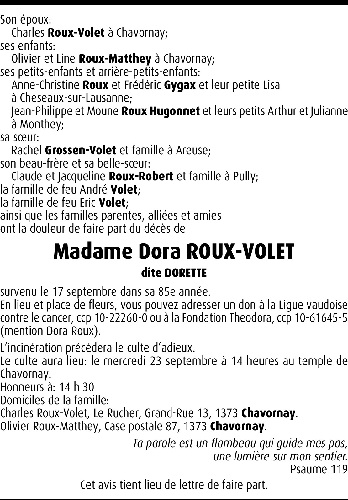 Lors de la perte d'un être cher, notre peine est immense. Dans ces moments de douleurs profondes, les gens se rassemblent pour soutenir ceux qui restent. La maladie rend ma présence impossible, cependant, j'espère que cette pensée sincère de sympathie et de compréhension pourra vous être d'un certain réconfort. Mes plus sincères condoléances. De la part d'un ancien élève. Charly