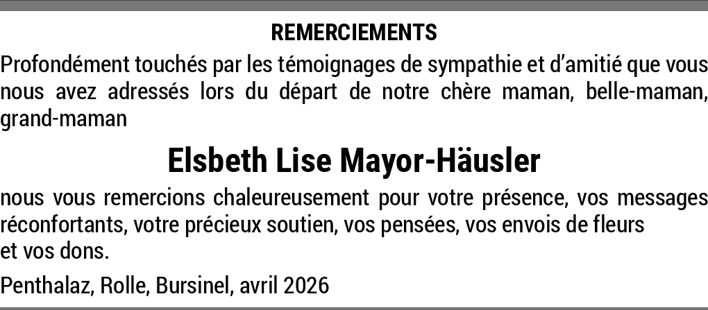 condoléances 20.02.2026 Signaler chez Lise tout était gentillesse et douceur: sa voix,son sourire sa silhouette peut-être le résultat d'une belle et heureuse vie avec Jean-Philippe et ses enfants.On la gardera ainsi en souvenir. RIP Doris Vautier et famille De la part de Doris Vautier