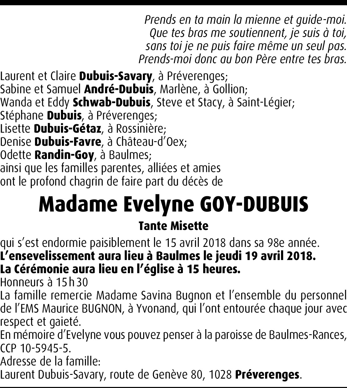 Il y a plus de 4 ans Report Nous vous prions d'accepter notre respectueuse sympathie. Nous savons combien ce malheur vous atteint et tenons à ce que vous sachiez toute la part que nous prenons à votre douleur. De la part de Michel et Christiane Sandoz