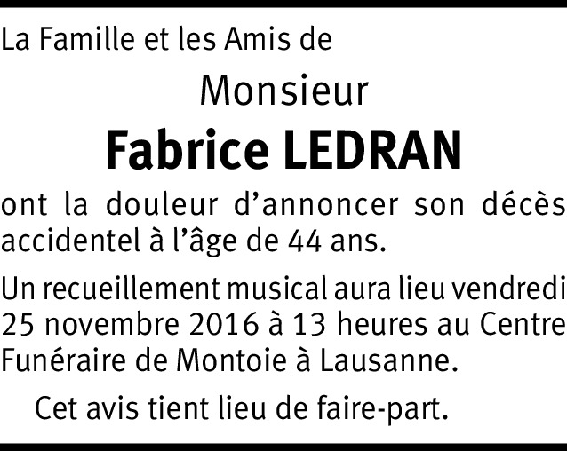 Le malheur qui vient de bouleverser votre famille nous a pétrifié. Sachez que nous sommes de tout cœur avec vous. Soyez assurés de notre chaleureuse sympathie et de notre indéfectible amitié.Un privilège de connaitre Fabrice, je ne t'oublierai jamais mon Ami'.