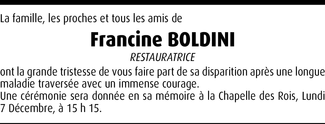 Pour moi, tu n’étais pas seulement Francine, un chef étoilé de la cuisine, mais «ma mère Boldin» comme je te surnommais affectueusement telle une mère de substitution…!