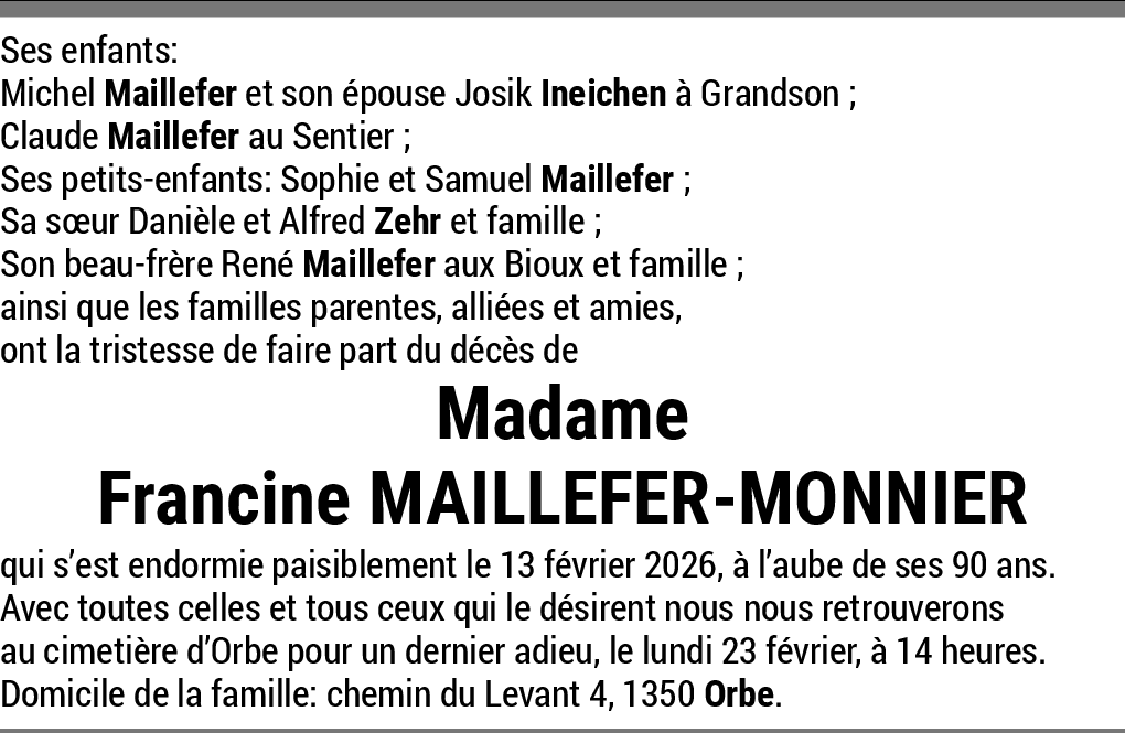 Condoléances 18.02.2026 Signaler Recevez, en famille, mes sincères condoléances. De la part de M. Ermini-Desponds
