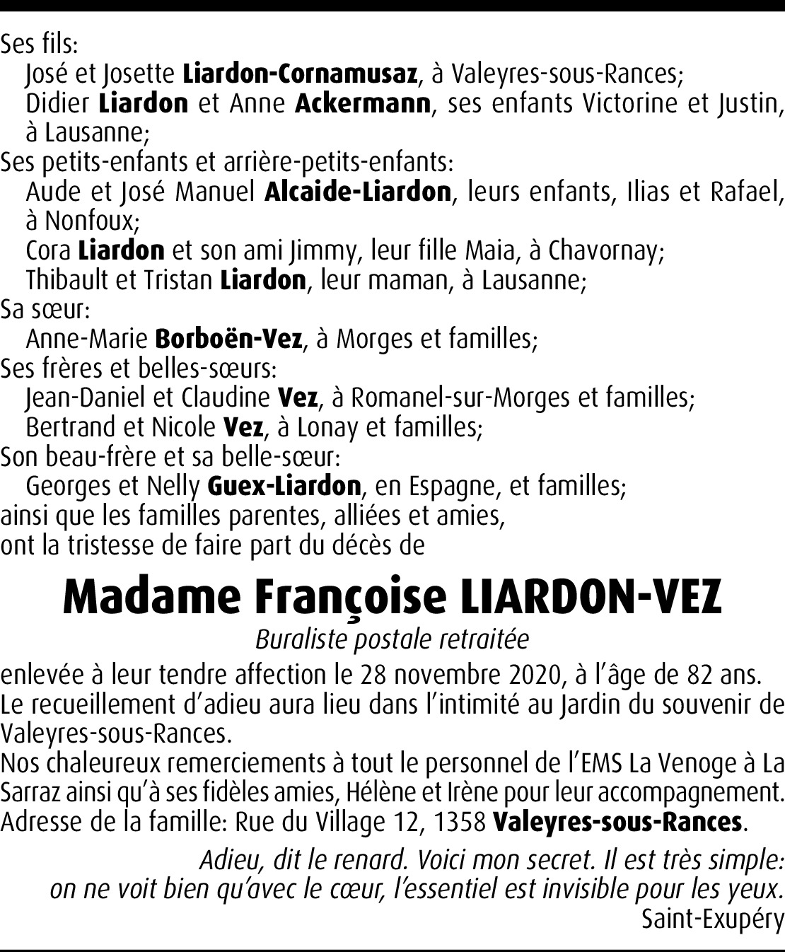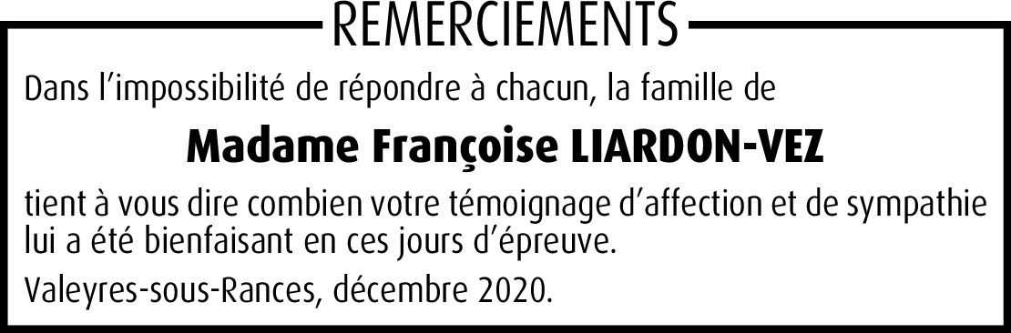 Cher José, Cher Didier lorsque j'ai annoncé cette triste nouvelle à mon fils Gaétan la première chose qui lui est venue à l'esprit comme Anne-Claude c'est les Noëls passés à Valeyres, on se souvient en particulier de la grande table avec le traditionnel jambon à l'os et dans le salon un grand sapin avec plein de cadeaux au pied. Nicole Gaétan et moi pensons beaucoup à vous et à toute la famille Liardon en ces jours de deuil, Bertrand