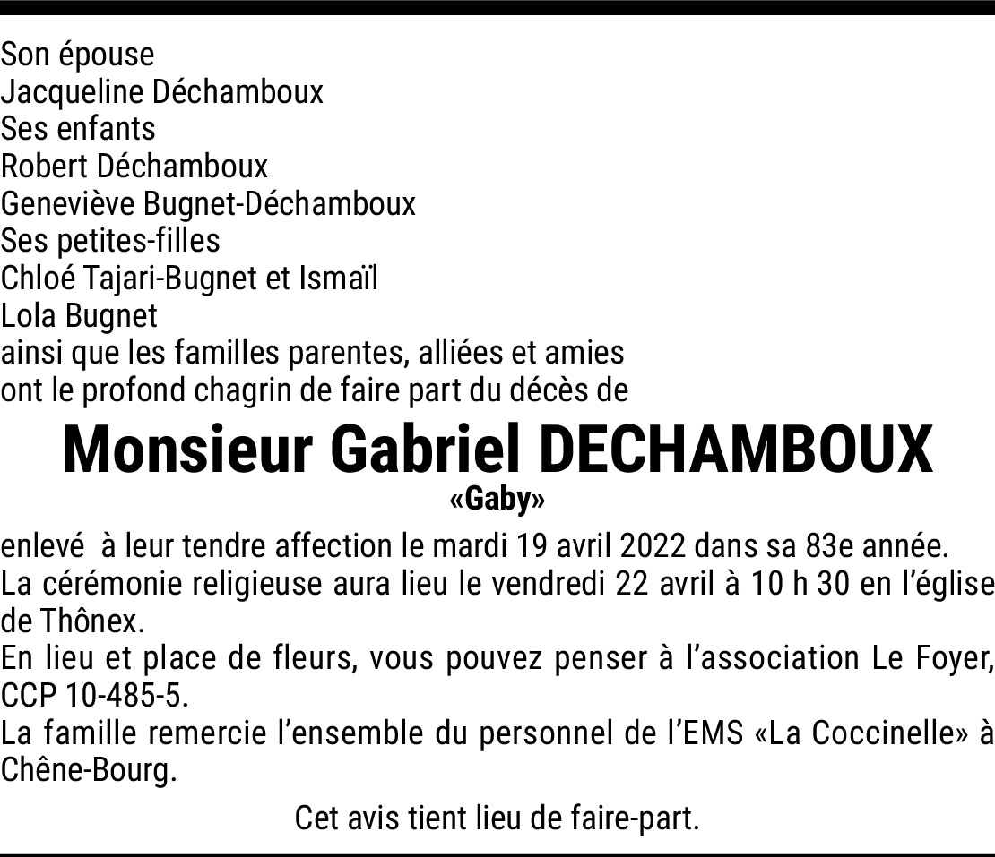 26.04.2022 Report J'apprends aujourd'hui le décès de Gaby ; avec retard je vous prie d'accepter mes plus sincères condoléances. Une pensée particulière pour Jacqueline. Richard Albanesi 344 rte du Chef Lieu 74270 Sallenoves / FR De la part de Albanesi