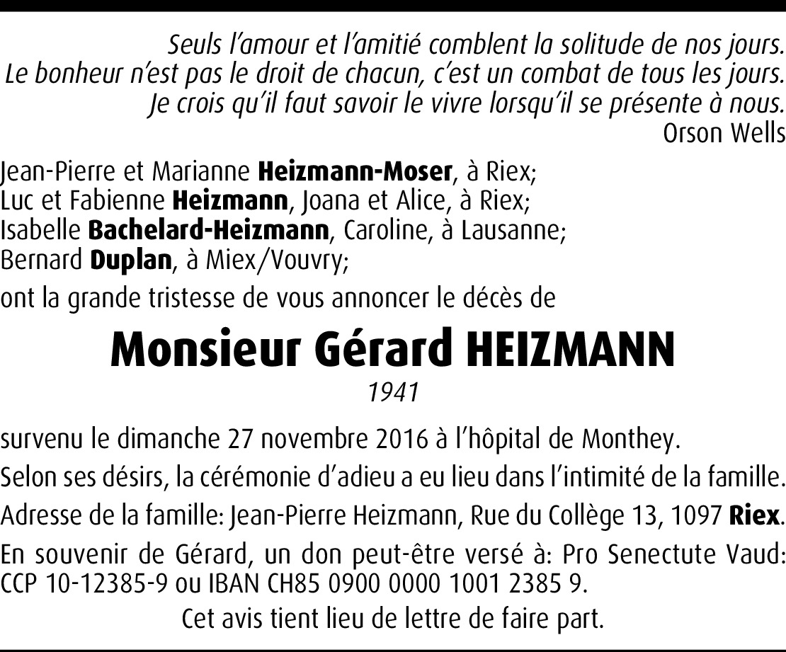 C'est avec grande tristesse que j'ai appris la mort de M. Heizmann, mes pensées sont avec toute la famille.