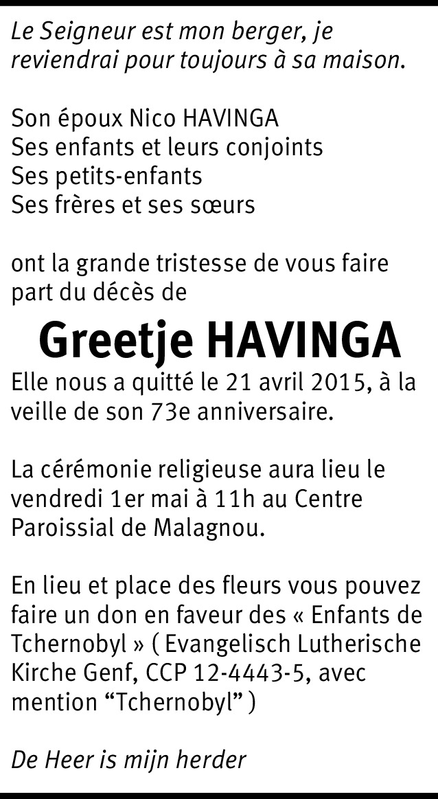 Veuillez accepter mes plus sincères condoléances. J'ai rencontré Greetje lors de tri de vêtements pour les enfants de Tchernobyl... J'ai même parlé en hollandais avec elle. Merci de tout ce qu'elle a pu faire pour notre association.