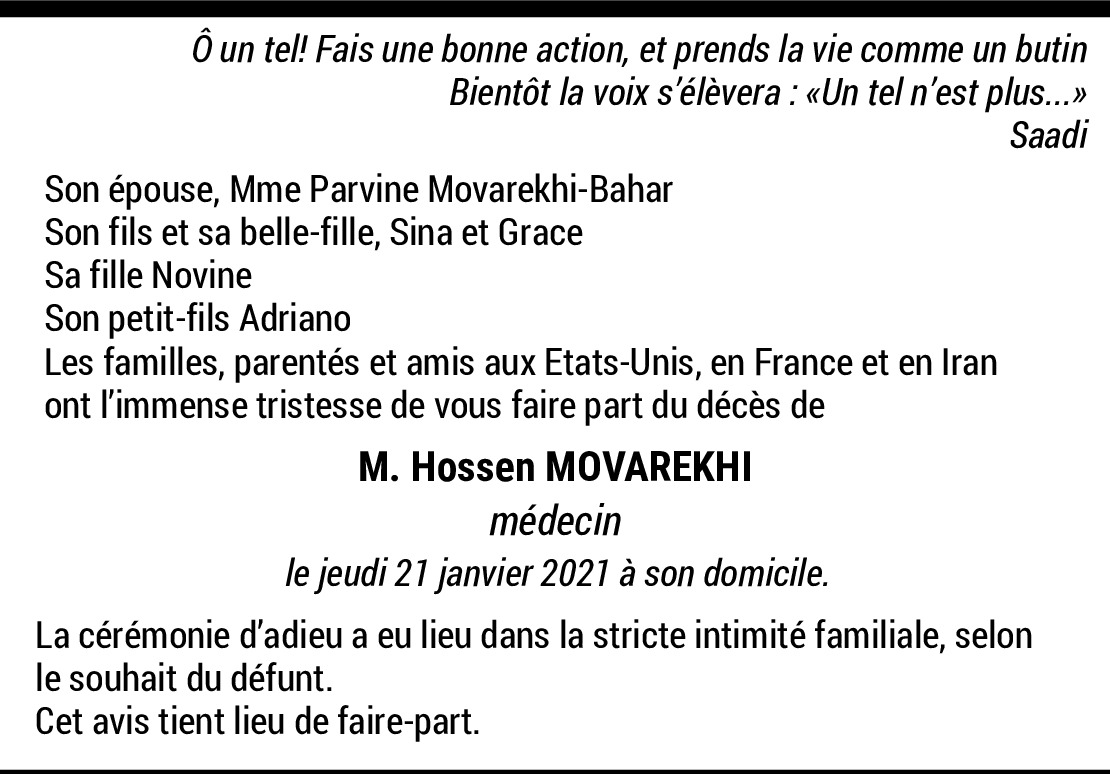 Il y a plus de 4 ans Report Cher Sina, Chère Grace, Je vous présente toutes mes condoléances et suis en pensée avec vous en cette difficile épreuve. Je vous embrasse. M-Christine De la part de Marie-Christine FOUVY