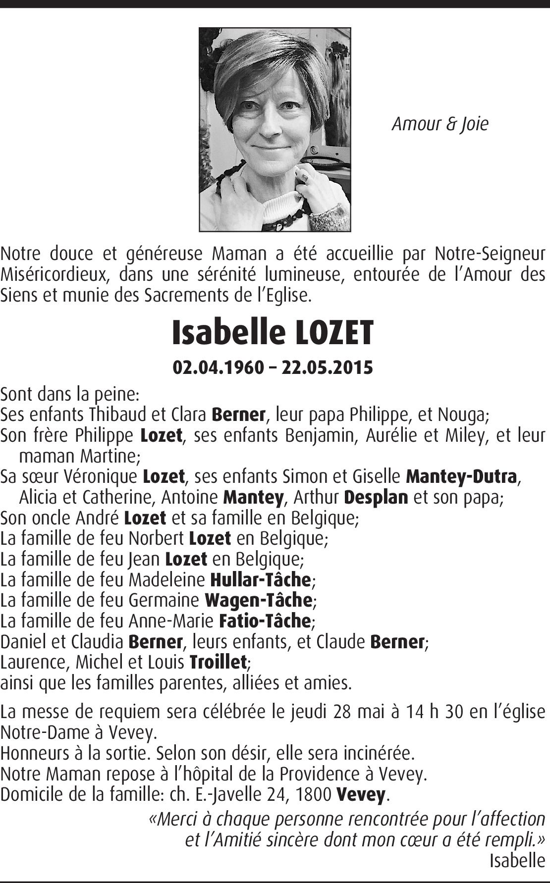 Chère Clara, cher Thibault, chère Véronique, cher Philippe, et toute la famille, Les fleurs se fanent et disparaissent, leurs précieux parfums demeurent toujours. Tout comme ces fleurs éclatantes, ceux que nous aimons ne meurent jamais; ils demeurent avec nous pour toujours. Il faut aimer la vie et en apprécier chaque moment, car un jour nous irons vers d'autres horizons... votre maman, votre sœur a vécu auprès de vous une foule de moments doux qu'elle emporte avec elle dans sa nouvelle maison... En espérant que le temps atténuera votre douleur et que les beaux moments, à jamais gravés dans votre cœur, seront pour vous réconfortants. Recevez, chers enfants, chère Véronique et cher Philippe toute ma sympathie et sachez que je ne vous ai jamais oublié. Et surtout pas le «Amour et joie» de votre maman. Claude.