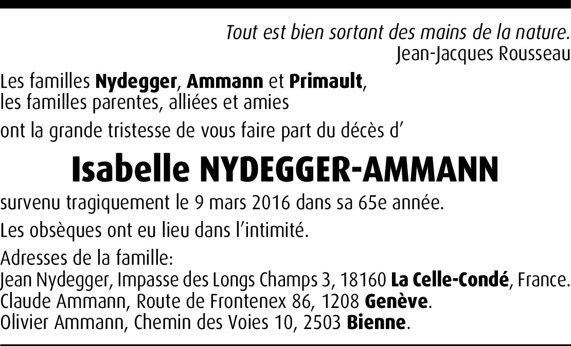Il y a plus de 4 ans Signaler Chère famille, de tout cœur je vous prie d'accepter mes sincères condoléances. L'annonce de sa disparition m'a profondément touchée. Que son âme retrouve la paix! Courage à tous. Christine (maman de Christelle Nydegger) De la part de Christine Felgenhauer