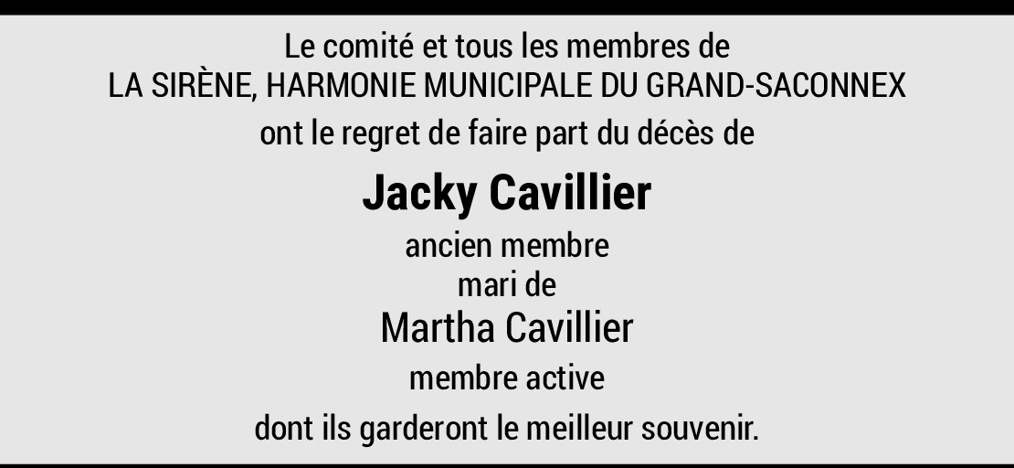 Nous vous adressons toute notre sympathie et nos sincères condoléances à l'occasion du départ de Jacky. Nous vous souhaitons plein de courage et pensons bien à vous en ces moments difficiles.
