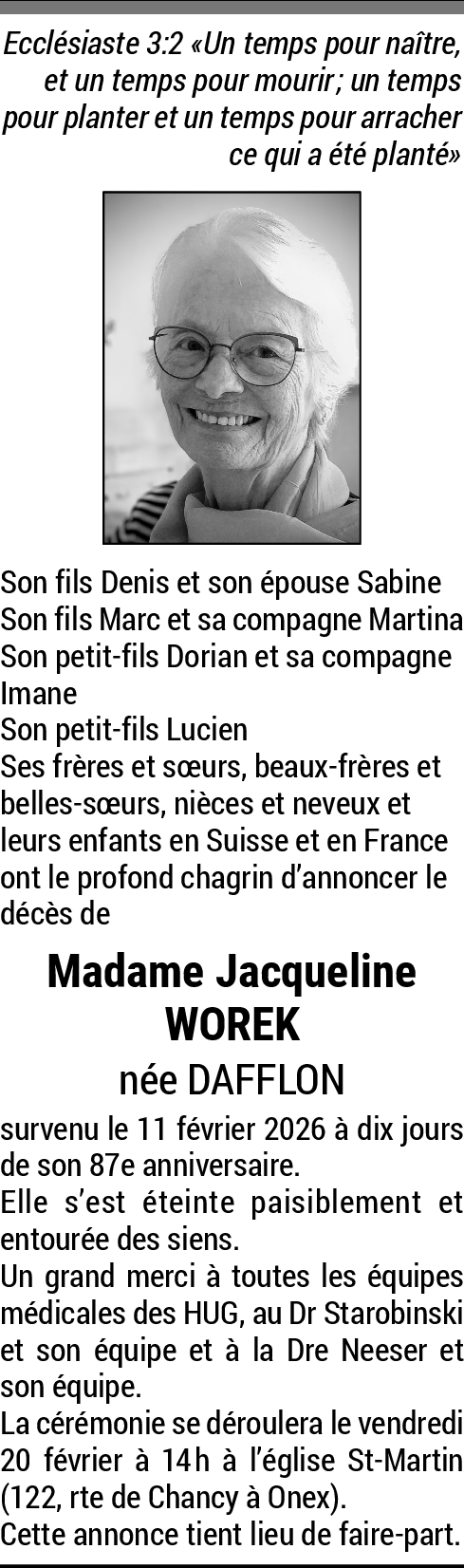 Jacqueline Woreck était un membre fidèle de notre association depuis 2015. J'ai eu le bonheur de la rencontrer de temps à autre. Son décès me peine et son beau sourire me manque déjà. Avec toute ma sympathie.