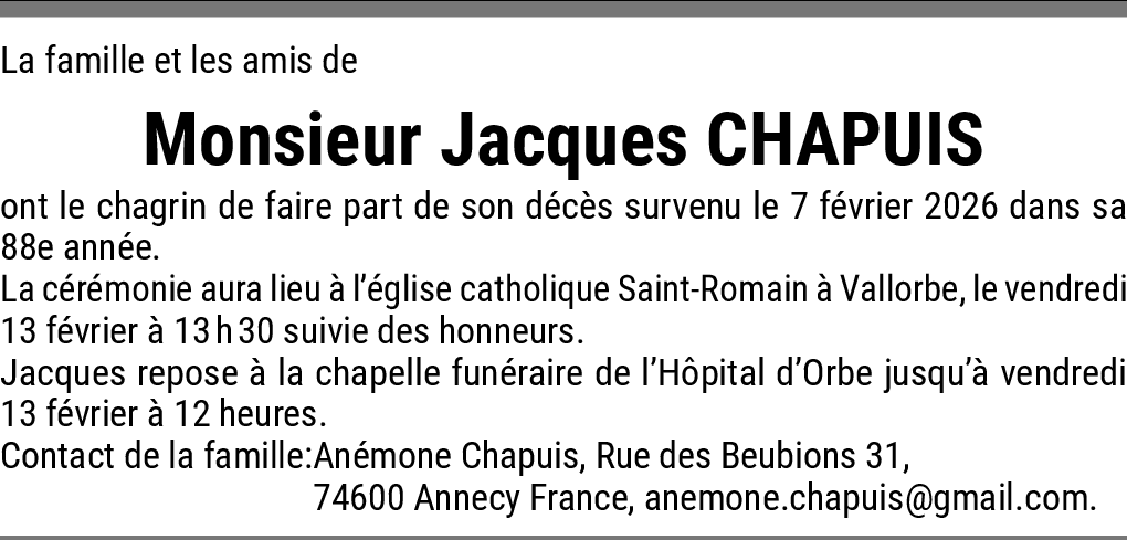 Chère Famille, veuillez accepter mes sincères condoléances. Nous avons été voisin pendant 14 ans, M. Chappuis à la boucherie et mes parents à la boulangerie.