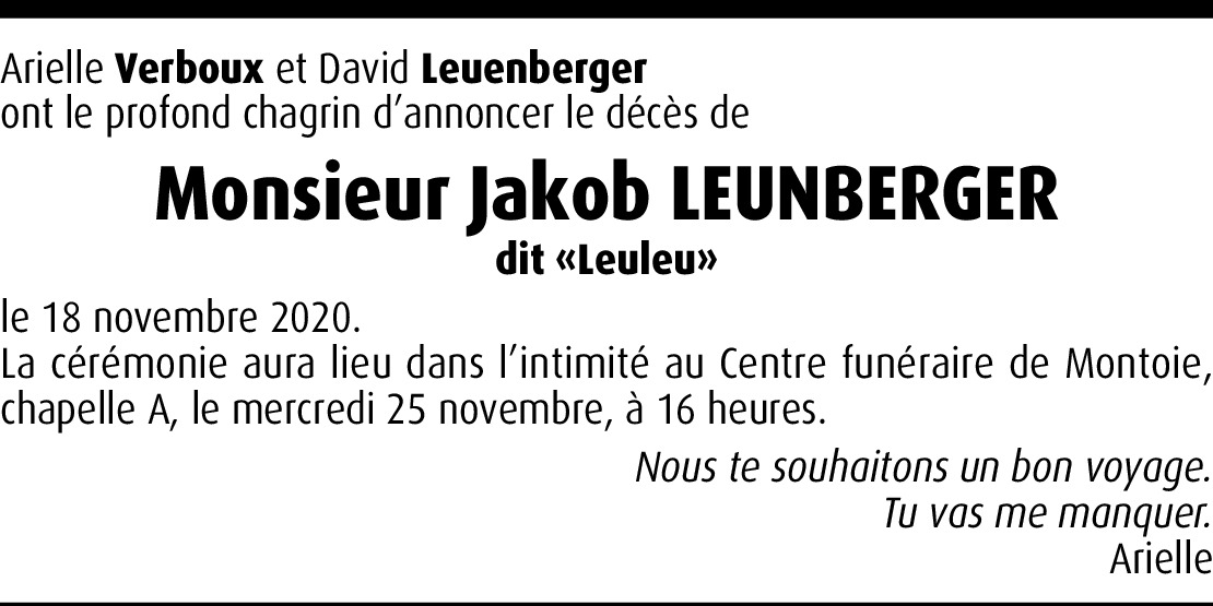 Il y a plus de 4 ans Report Arielle, David et Famille De tout cœur avec vous dans ces moments de séparation et de tristesse. Sincères condoléances Repose en paix Leuleu De la part de Catherine Georgy