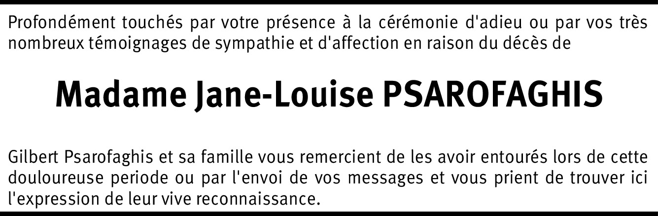Le malheur qui vient de bouleverser votre famille nous a pétrifiés. Sachez que nous sommes de tout cœur avec vous. J'ai bien connu Mme Psarofaghis qui était une grande amie de ma maman et c'est avec beaucoup de tristesse que je viens d'apprendre qu'elle nous a quittés. C'était une personne magnifique, d'une grande intelligence et d'une grande sensibilité, toujours prête à aider. Nous sommes bien en pensée avec vous dans ces tristes moments.
