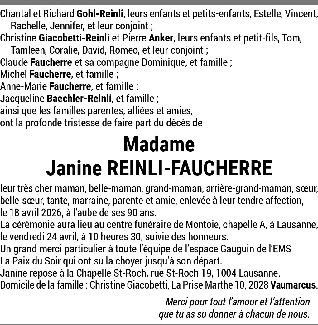 Je regrette de ne pouvoir être à vos côtés. Je me suis cassé la clavicule et suis en convalescence. J'habite maintenant à Crissier dans un appartement protégé (Lentillières 1c). Je conserve que de bons souvenirs de Janine, de sa maman, de Freddy et de vous bien naturellement. Je vous embrasse tous très fort.