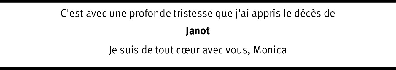 Il y a plus de 4 ans Signaler Venant d'apprendre tardivement la triste nouvelle, je souhaite à travers ce mot vous témoigner mes sincères condoléances. Que l'Amour et la Lumière accompagnent notre très cher Janot... Ariane De la part de Ariane Orlandi