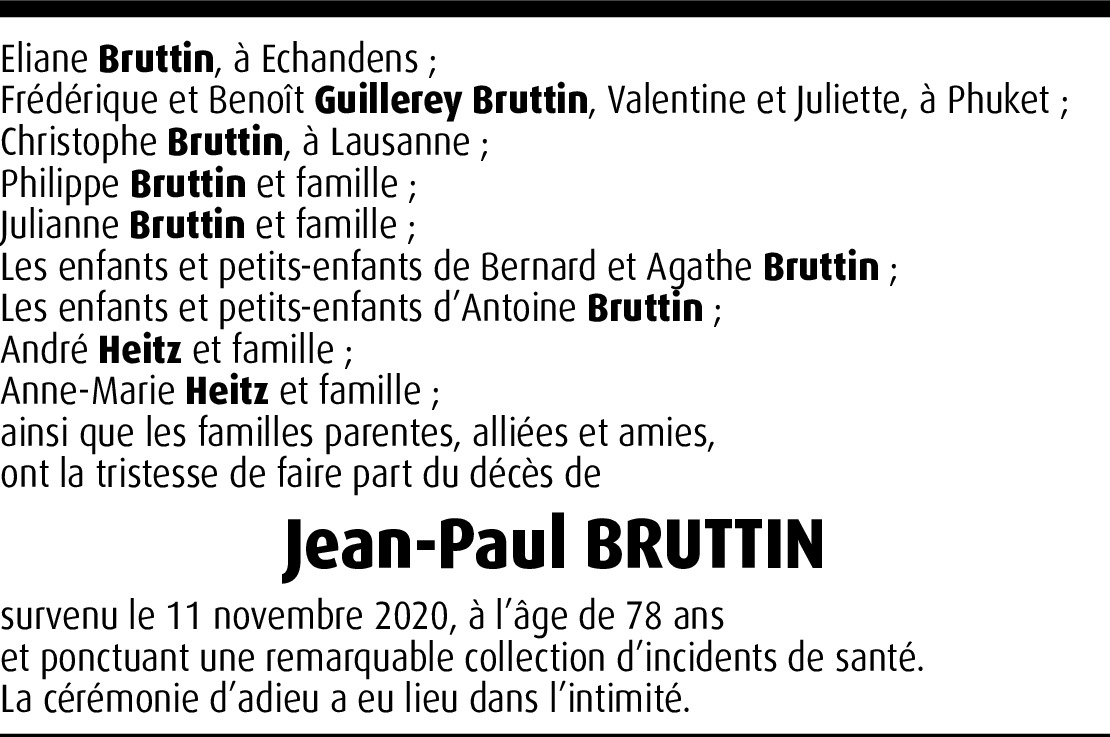 Madame, Une hospitalisation fait que je n'ai que tardivement appris le décès de Jean-Paul. Avec son départ, c'est une page de ma vie professionnelle qui se tourne puisque nous avons eu le plaisir de collaborer de nombreuses années durant. Collaboration empreinte de cordiales relations. Je vous présente, ainsi qu'à vos proches, toute ma sympathie.