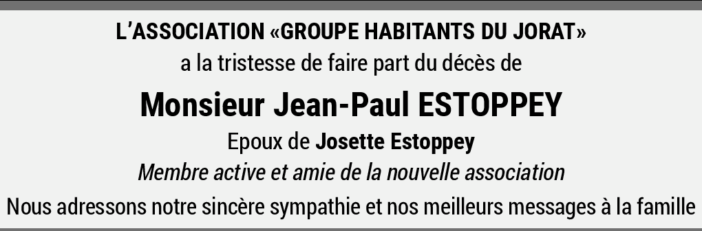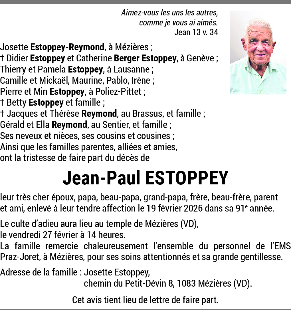 Deuil Jean-Paul Estoppey 24.02.2026 Signaler Cher Famille C'est avec beaucoup de tristesse que j'ai appris le décès de Jean-Paul. De tout coeur en pensées avec vous. Sincères Condoléances. De la part de kaltenrieder werner