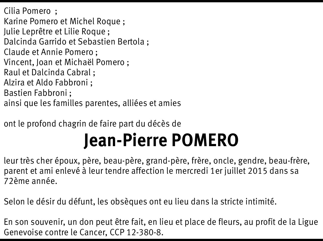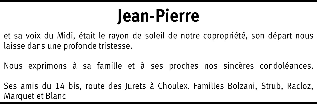 Jean pierre, nous t'avons connus en 1980 à Fréjus et tu étais devenu un veritable ami sur qui l'on pouvait compter. Je viens d' apprendre ton dèces et Martine et moi sommes profondèment attristés . tu resteras a jamais dans nos coeurs et ton rire résonnera toujours pour nous . A Cilia , Karine et toute la famille nous adressons nos sincères condoléances . repose en paix Sagittaire .